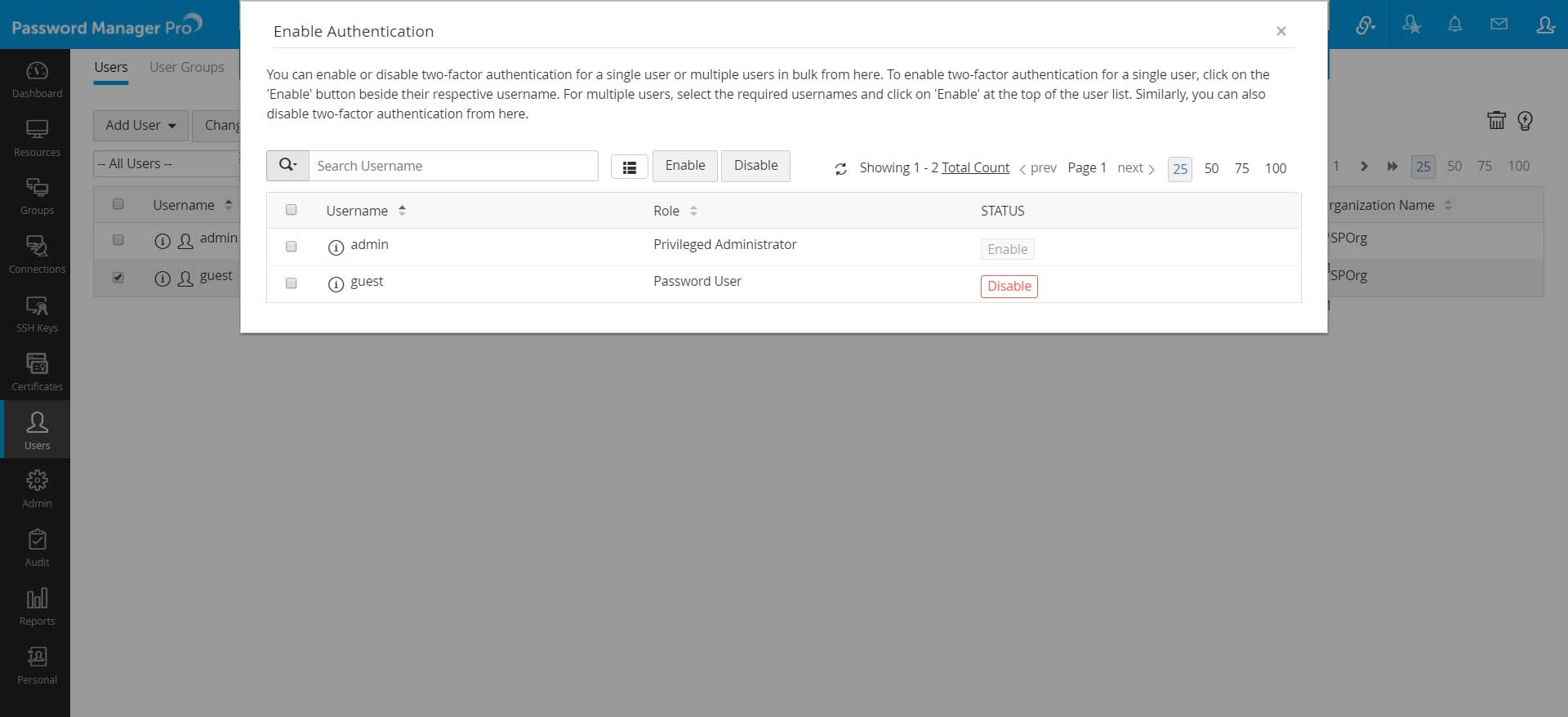 - ここから、単一ユーザーまたは複数のユーザーに一括で2段階認証を有効化、または無効化できます。単一ユーザーに2段階認証を有効にするには、各ユーザー名の横にある[有効化]ボタンをクリックします。複数のユーザーの場合は、必要なユーザー名を選択し、ユーザー一覧の上部にある [有効にする] をクリックします。同様に、ここから認証を[無効]にすることもできます。