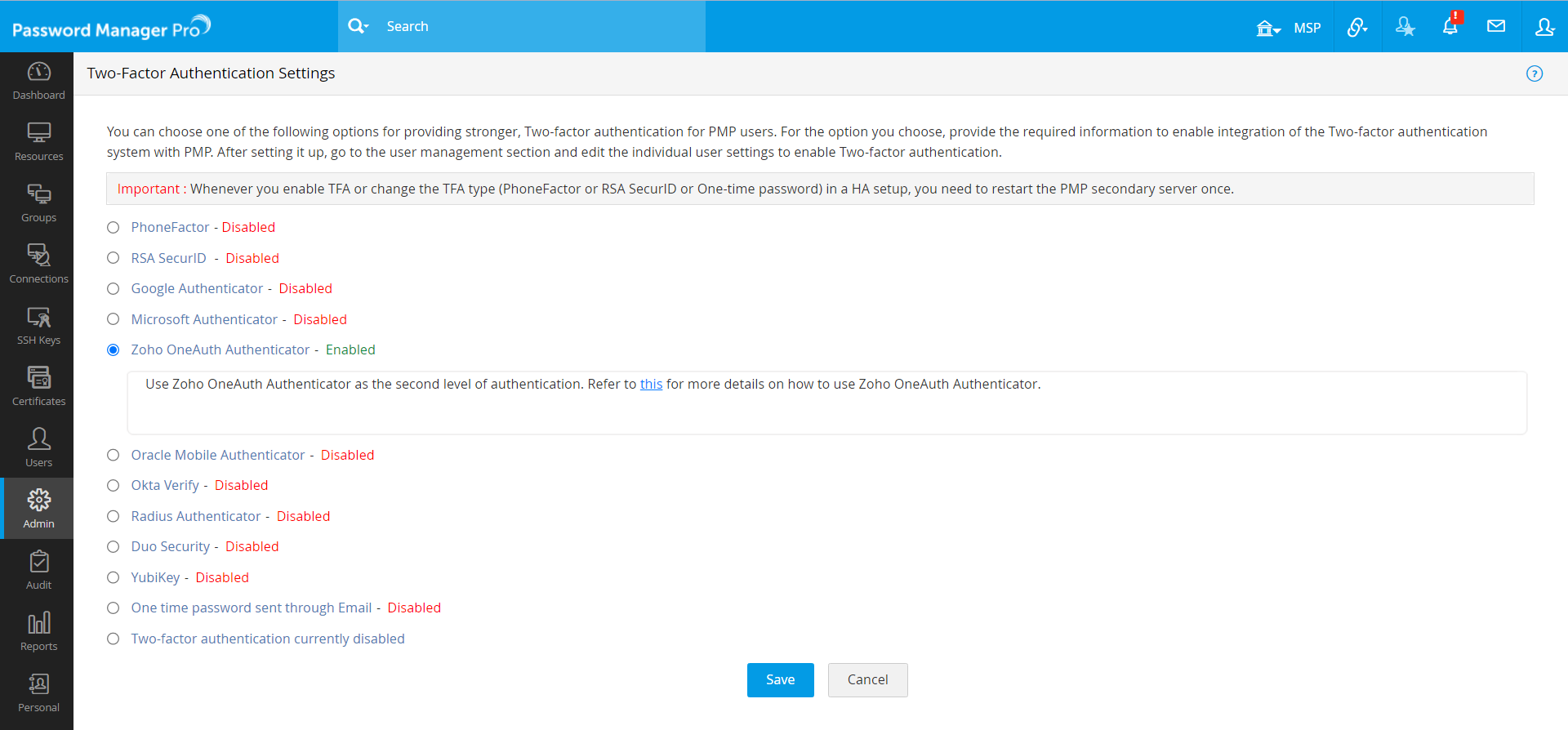 - [Zoho OneAuth Authenticator]オプションを選択し、[保存]をクリックします。