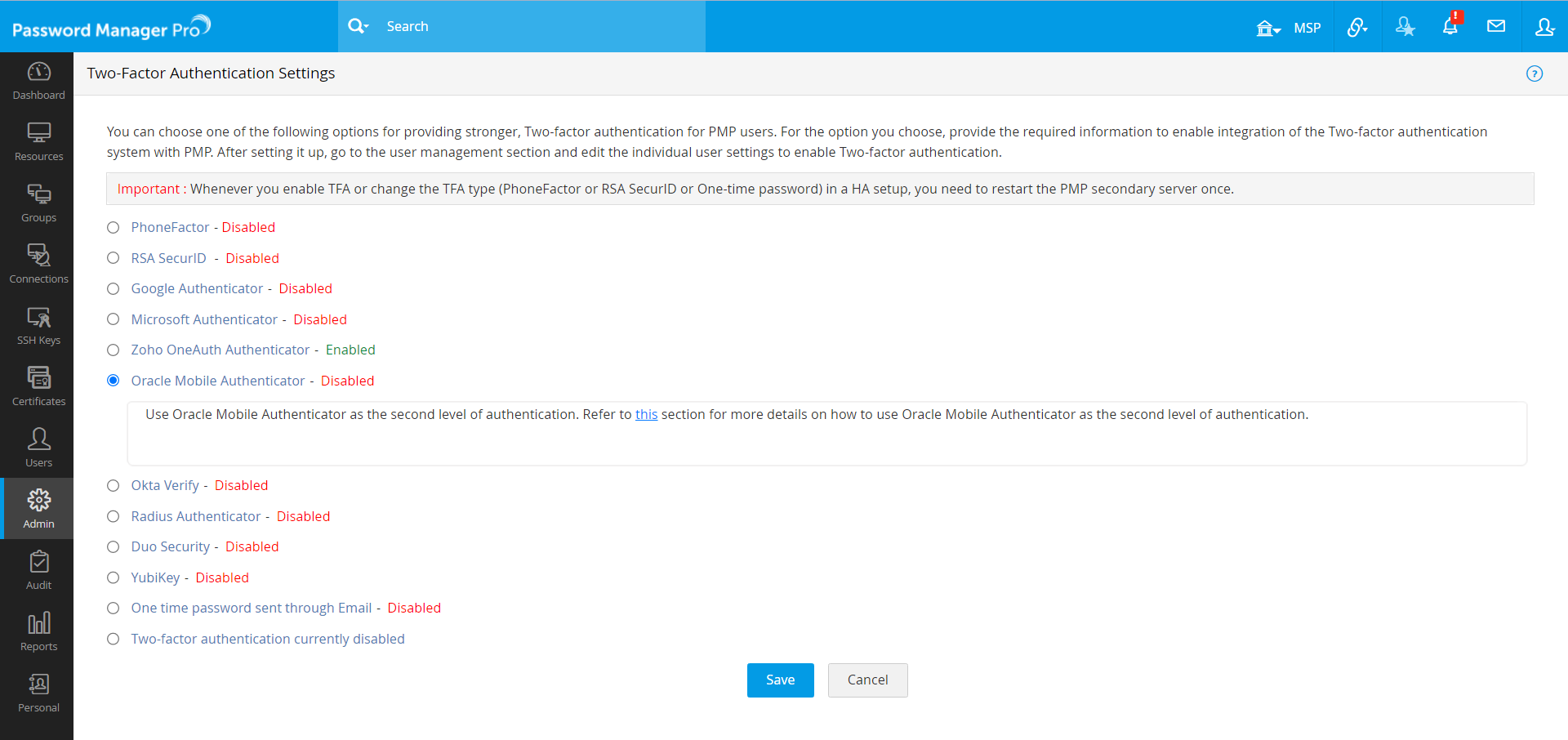 - [Oracle Mobile Authenticator]オプションを選択し、[保存]をクリックします。