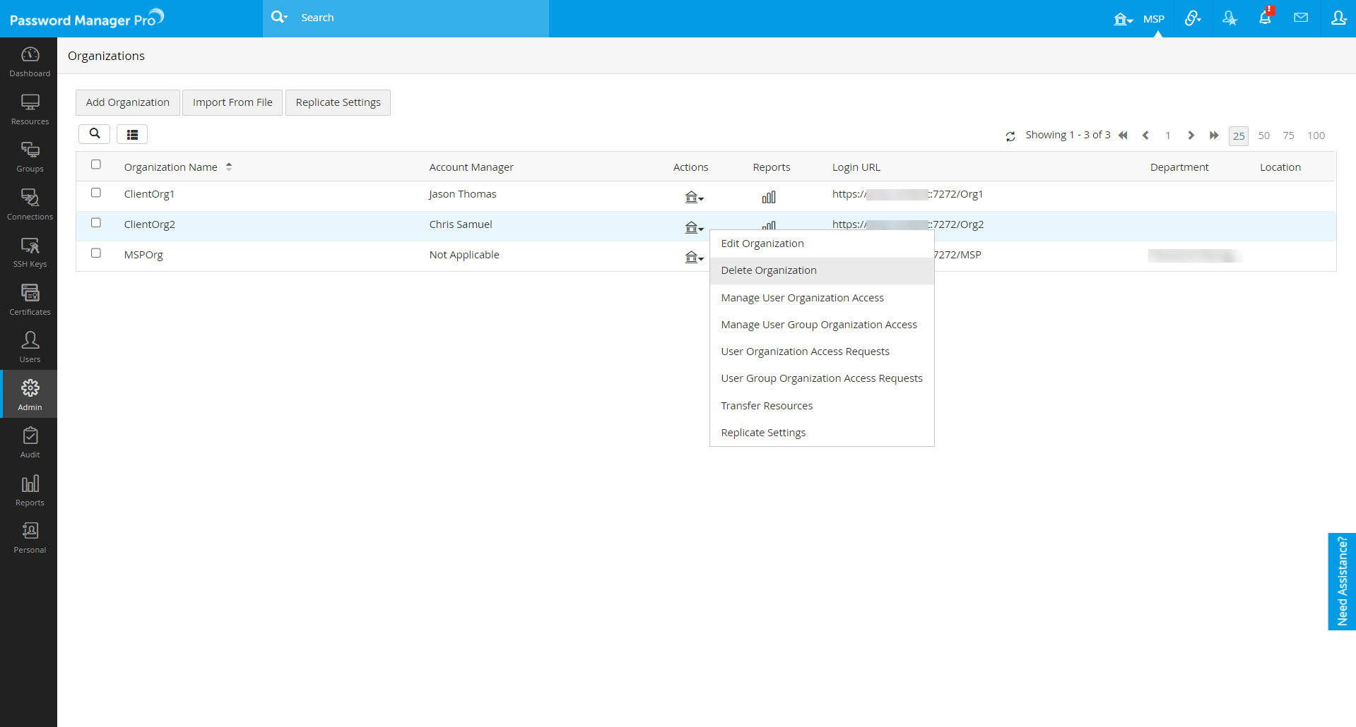 MSPOrg 管理者である場合にのみ、Password Manager Pro でクライアント組織を削除できます。さらに、次のいずれかの権限も必要です。