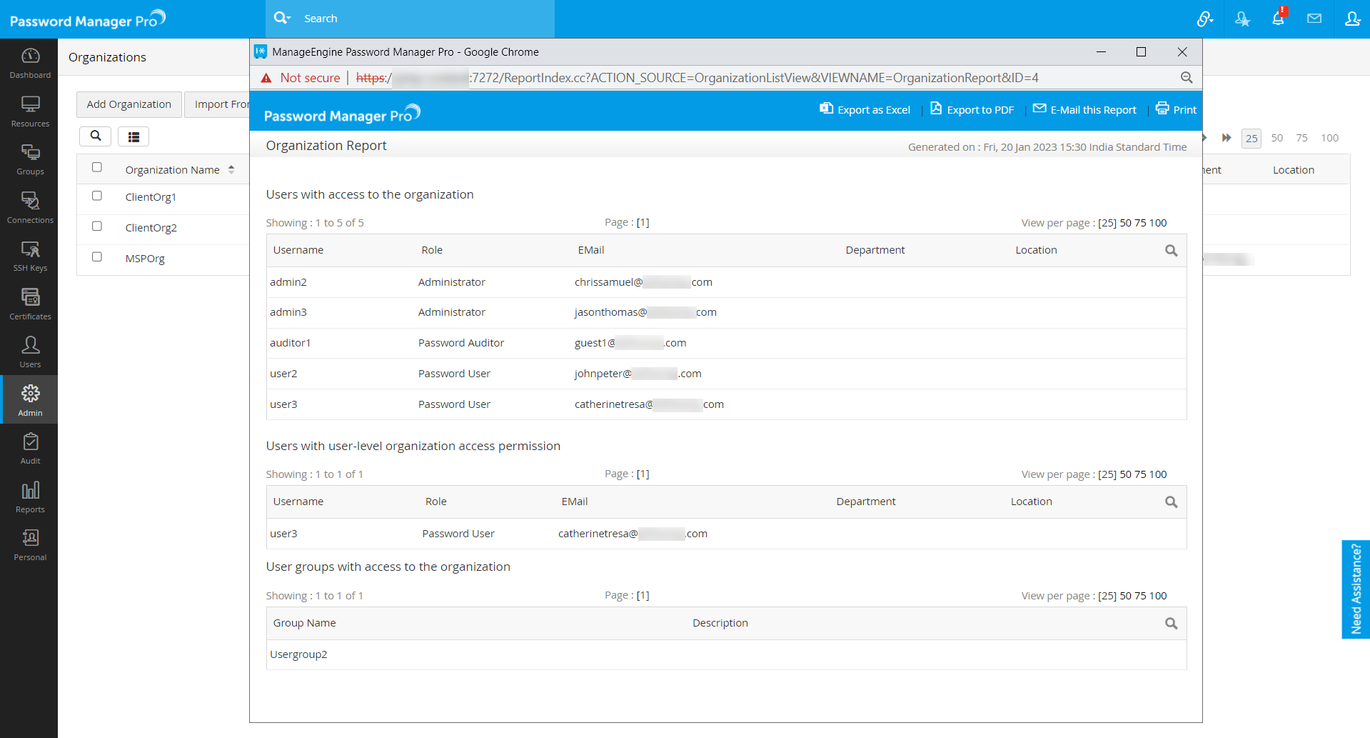 クライアント組織が管理されているユーザーおよびユーザー グループについて詳しく知るためのレポートを生成することもできます。これを行うには、[管理] >> [組織] >> [組織] に移動し、該当のクライアント組織の横にあるレポート アイコンをクリックします。開いたウィンドウに、さまざまなレベルで管理されているユーザーとユーザー グループのリストが表示されます。