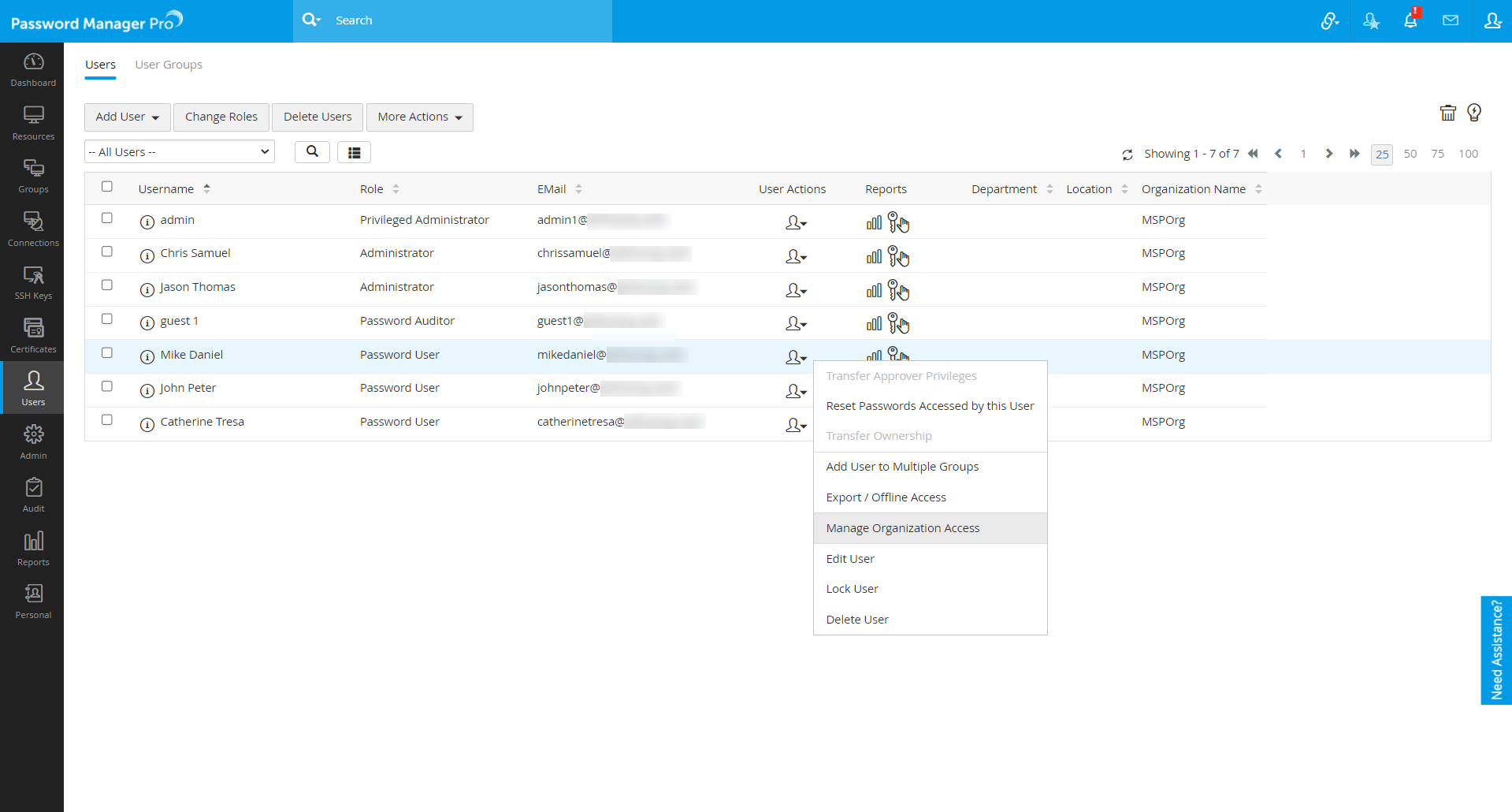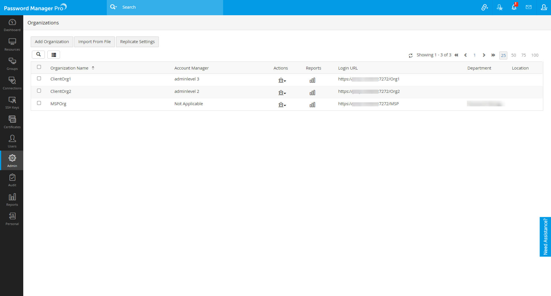 MSP Editionは、Password Manager Pro の基本的なパスワード資格モデルにも準拠しています。つまり、いつでも、所有および共有されているパスワードのみを表示できます。MSP 管理者は、管理している組織の名前を表示できますが、すべての顧客に関するデータは、顧客のリソースを追加するか、顧客があなたとリソースを共有している場合にのみ表示できます。顧客は自分の組織に属するデータのみを表示できます。