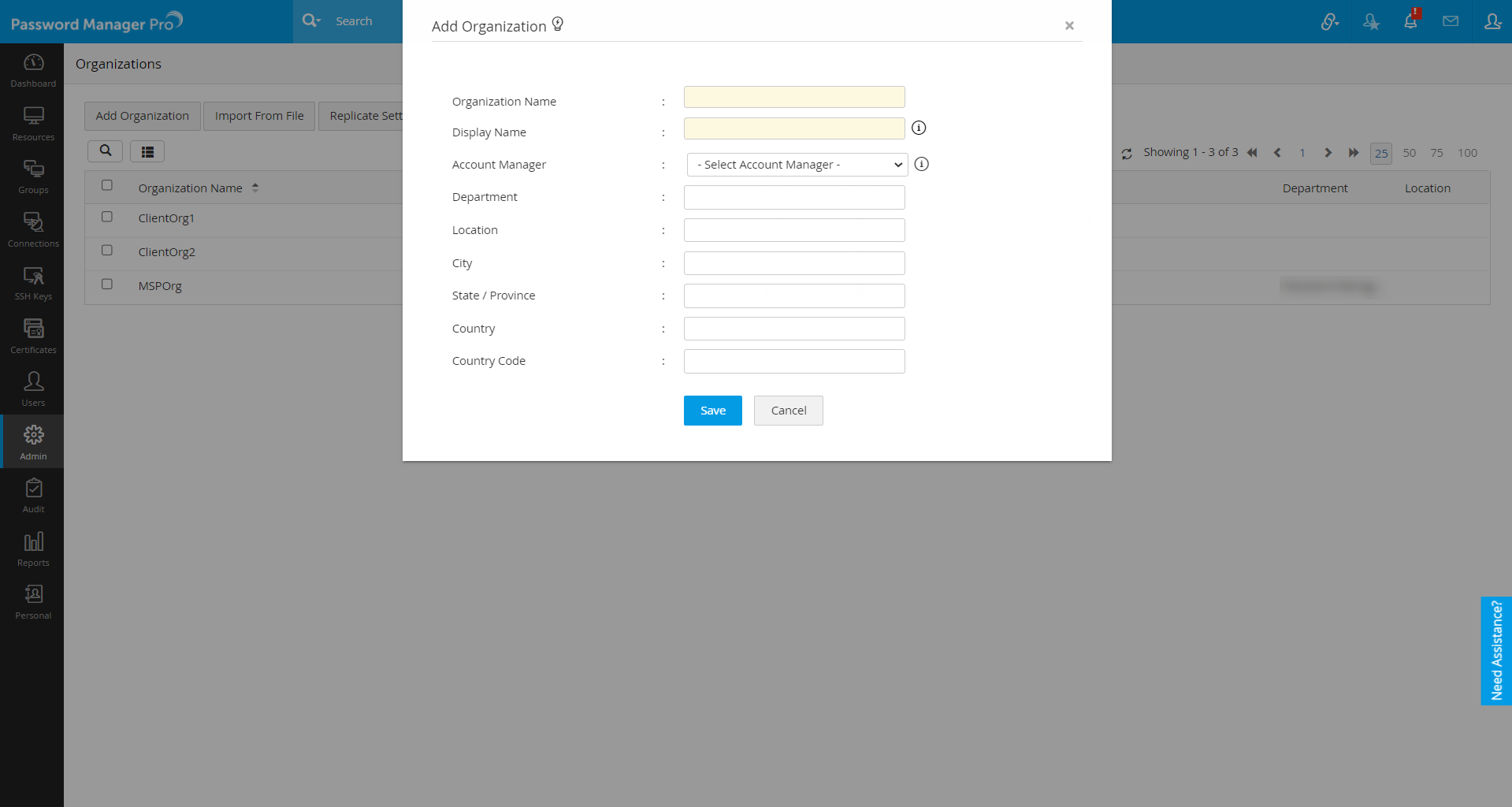 ユーザーを追加した後、クライアント組織を追加する必要があります。[管理] >> [組織] >> [組織] に移動して、クライアント組織を追加します。MSP によって管理される組織は、ここで Password Manager Pro に登録する必要があります。