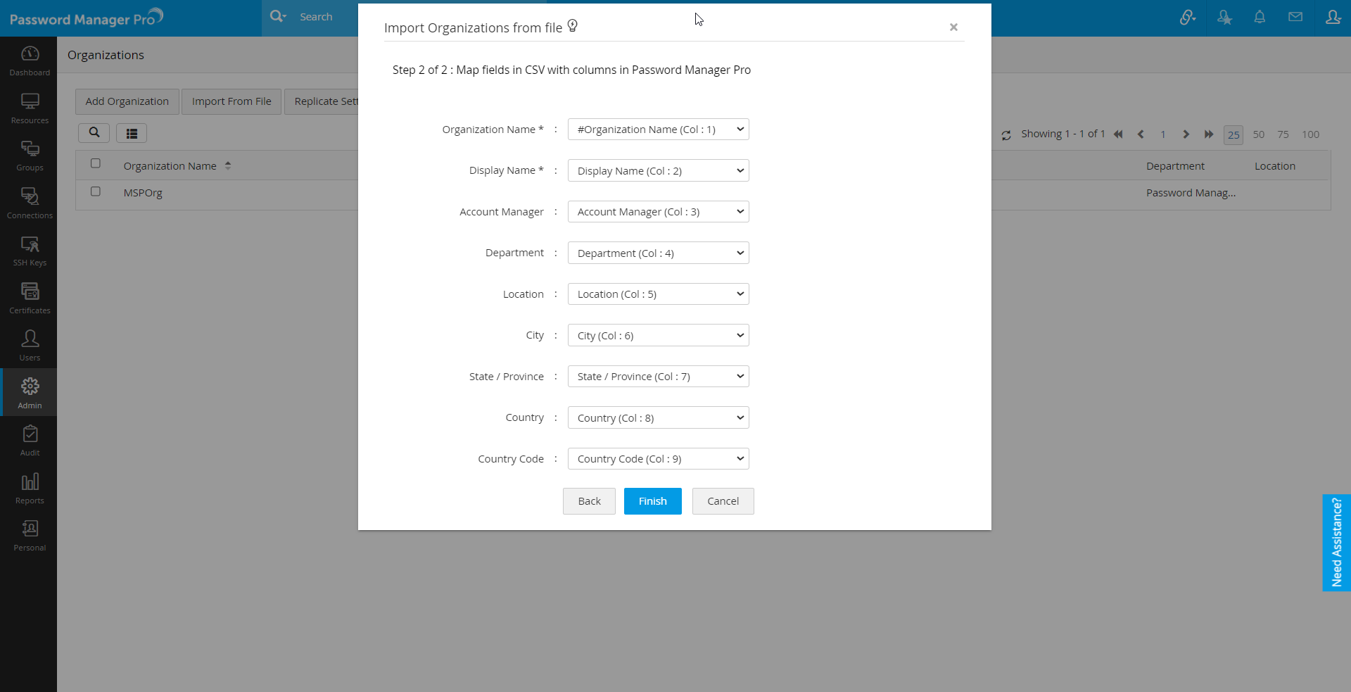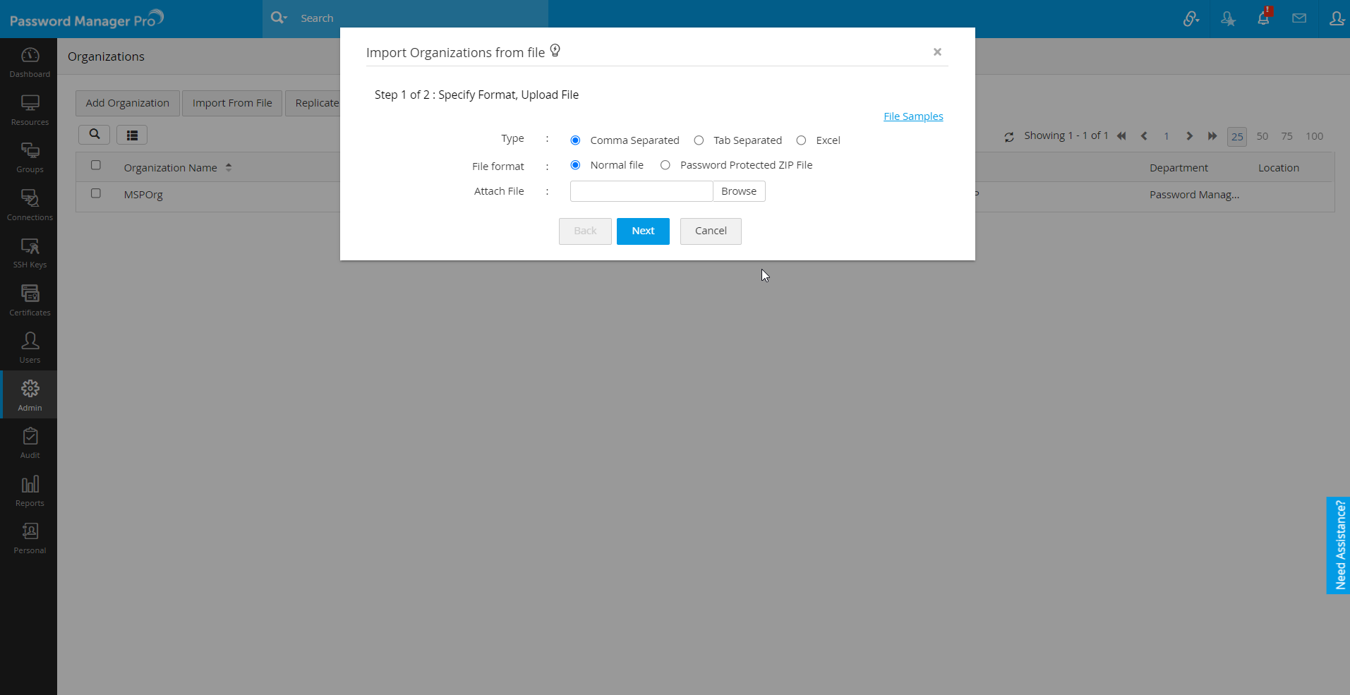 インポート ウィザードを使用して、CSV ファイルから複数の組織をインポートできます。CSV には、組織名、表示名、その他の詳細に関するエントリがカンマ区切り形式で含まれている必要があります。各組織のエントリは新しい行に入力する必要があります。CSVファイルのすべてのラインは一貫し、フィールド数が同じである必要があります。拡張子が .txt および .csv の CSV ファイルが許可されます。