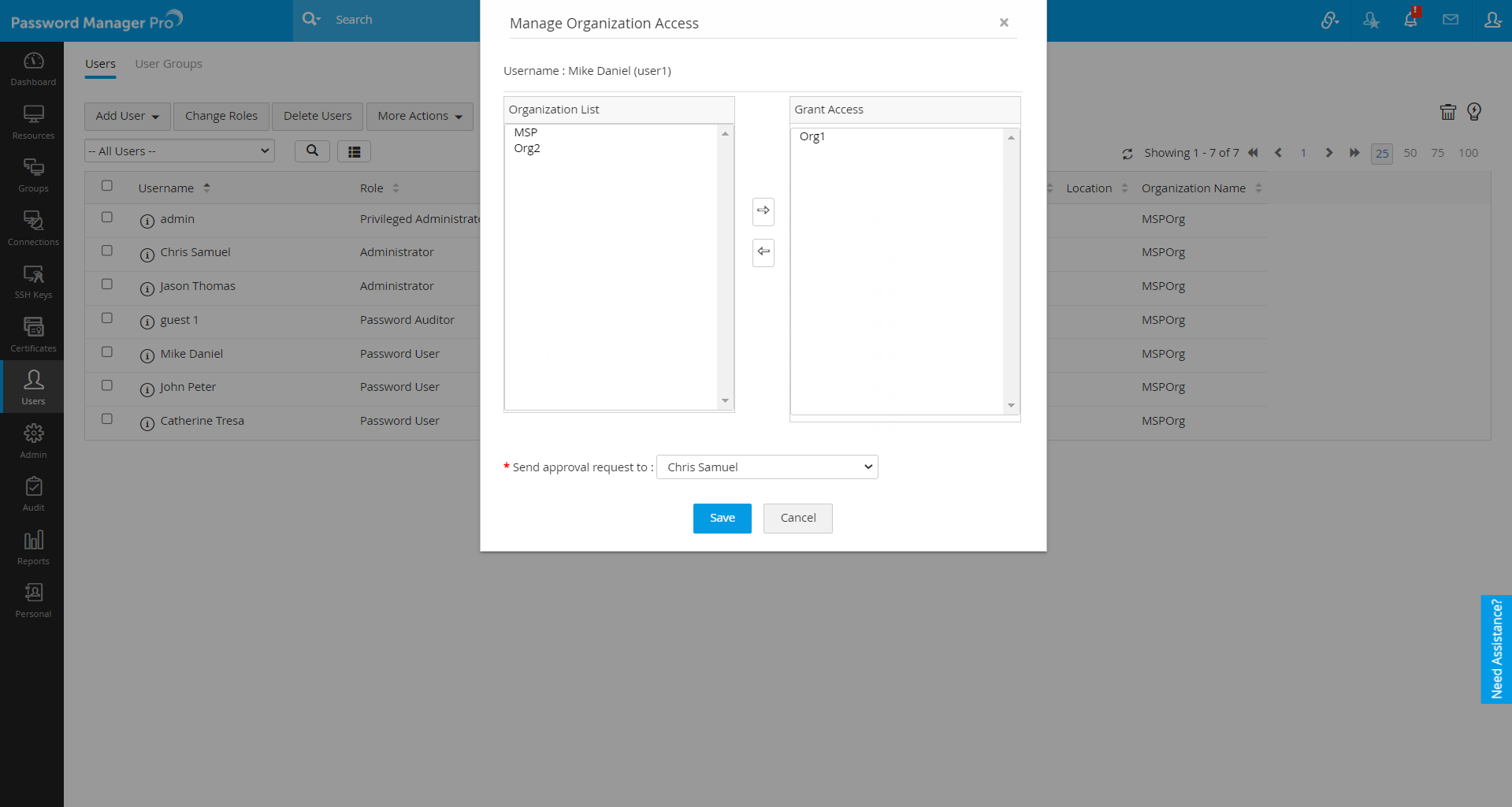 Password Manager Pro では、セキュリティを強化するためにクライアント組織を管理する前に承認が必要です。MSP の管理者はクライアント組織の組織アクセスを開始できますが、MSP の他の管理者による承認が必要です。リクエストを開始した人または開始された人がリクエストを承認することはできません。これは、管理者が他の管理者の承認なしに自分で管理権限を取得したり、その権限を他の人に付与したりできないようにするためです。これは本質的に、このプロセスを実行するには、MSP組織に少なくとも3名の管理者が必要であることを意味します。