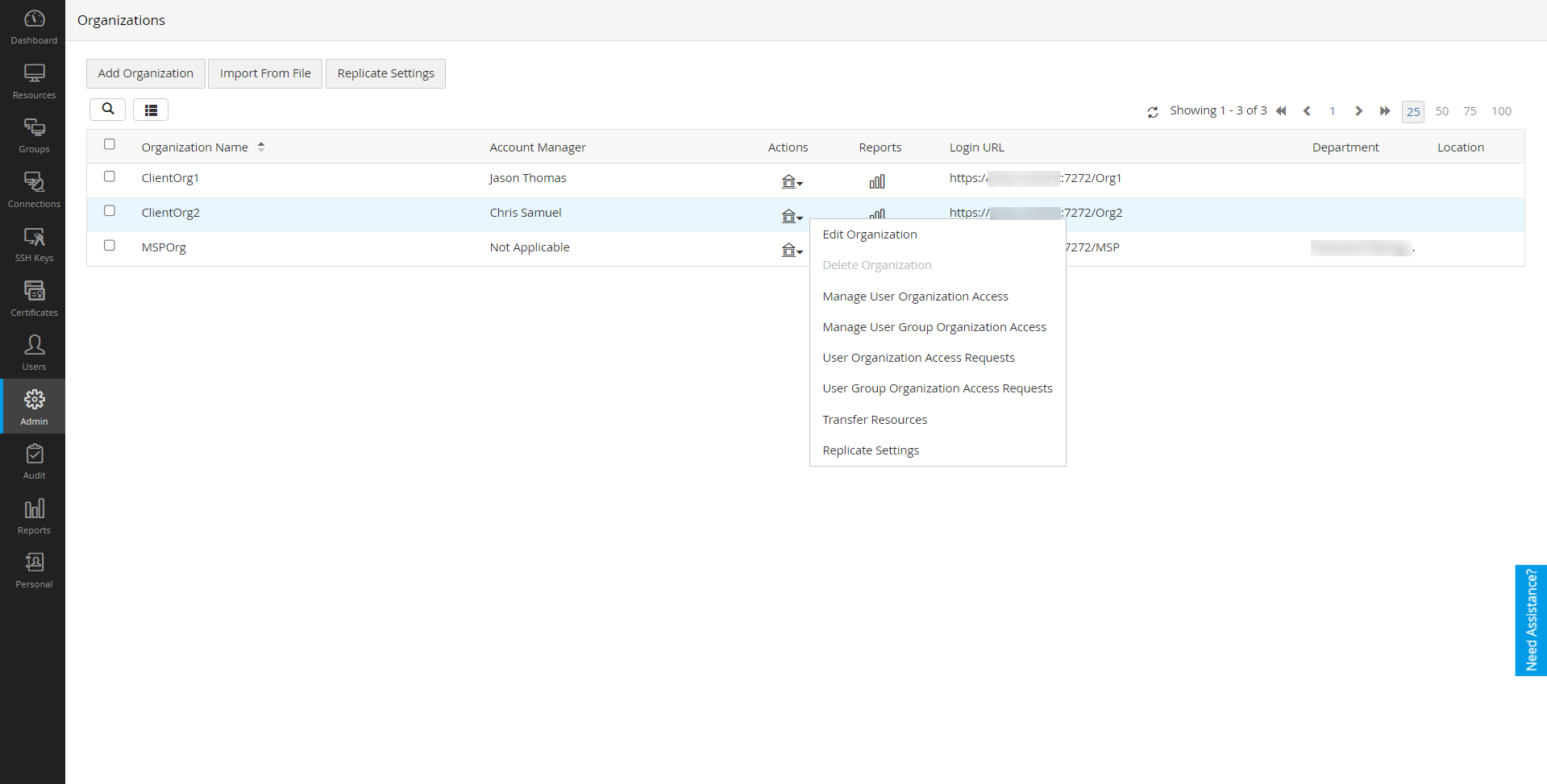 該当の組織の横にある[アクション]アイコンをクリックして、[組織]ページから次の操作を実行することもできます。