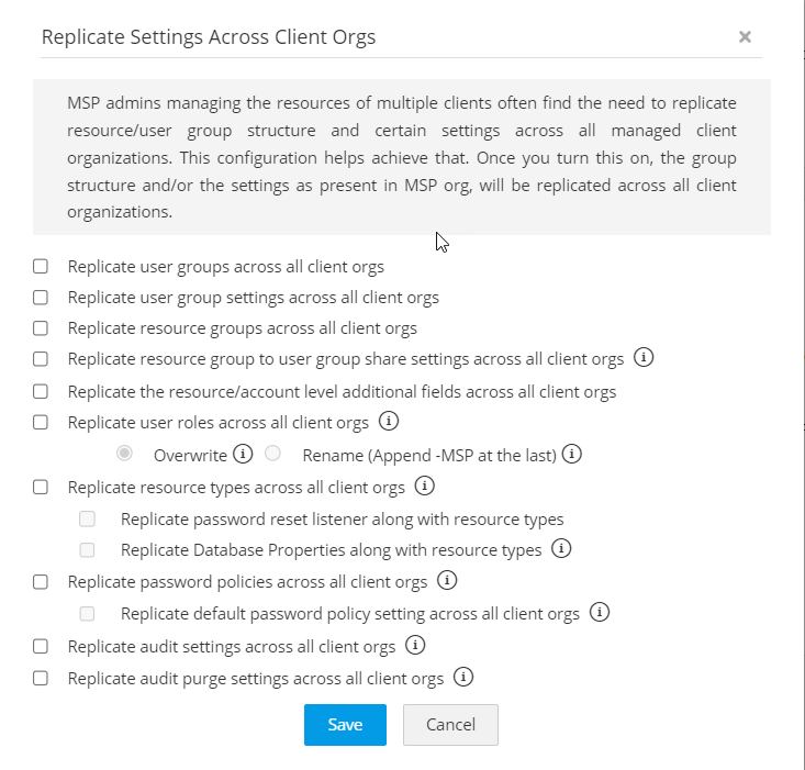 - すべてのクライアント組織間でユーザーの役割を複製 - MSP組織の使用可能なユーザーの役割をすべてのクライアント組織間で複製します。