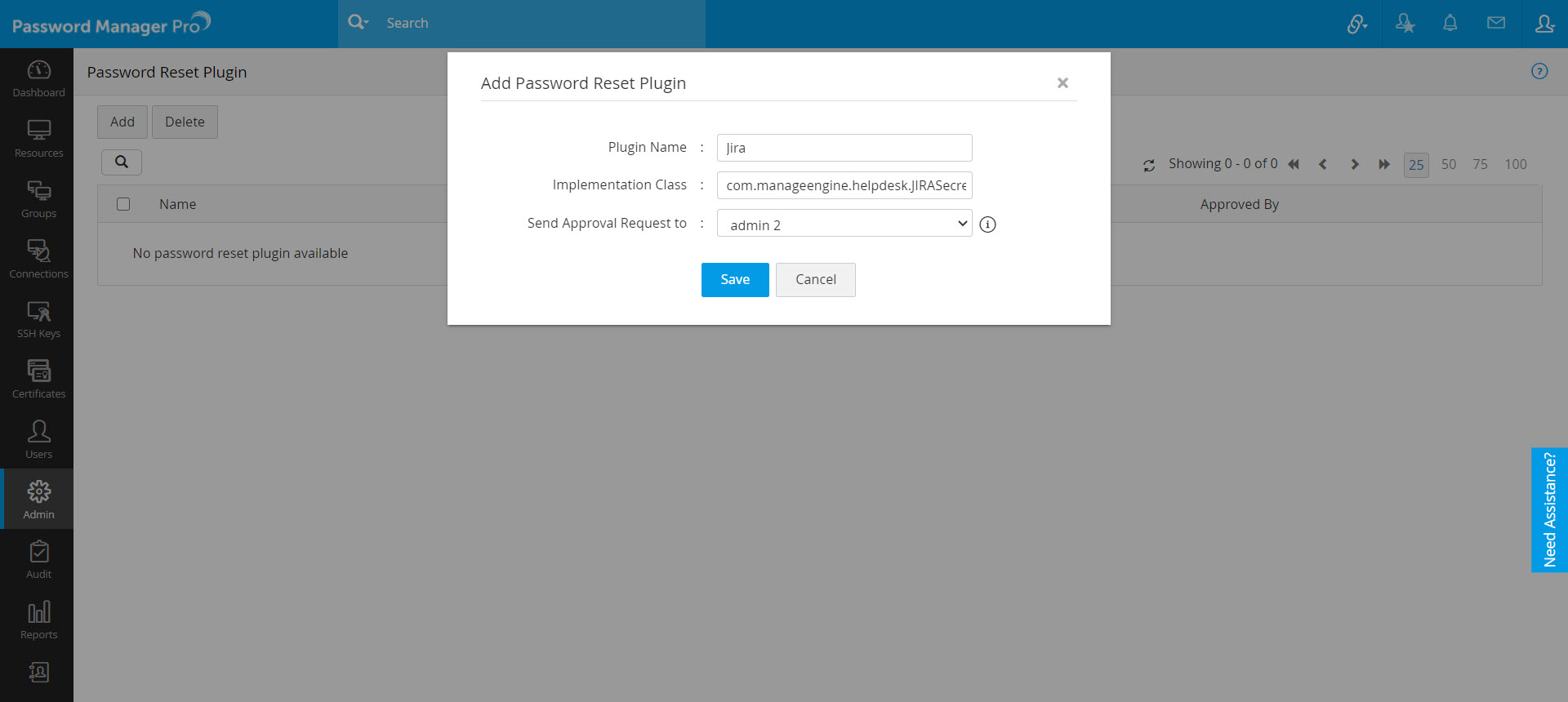 - 表示されるダイアログボックスで、プラグインに適切な名前を付け、実装クラスの名前を指定します (例:com.manageengine.helpdesk.JIRASecretResetPlugin)。