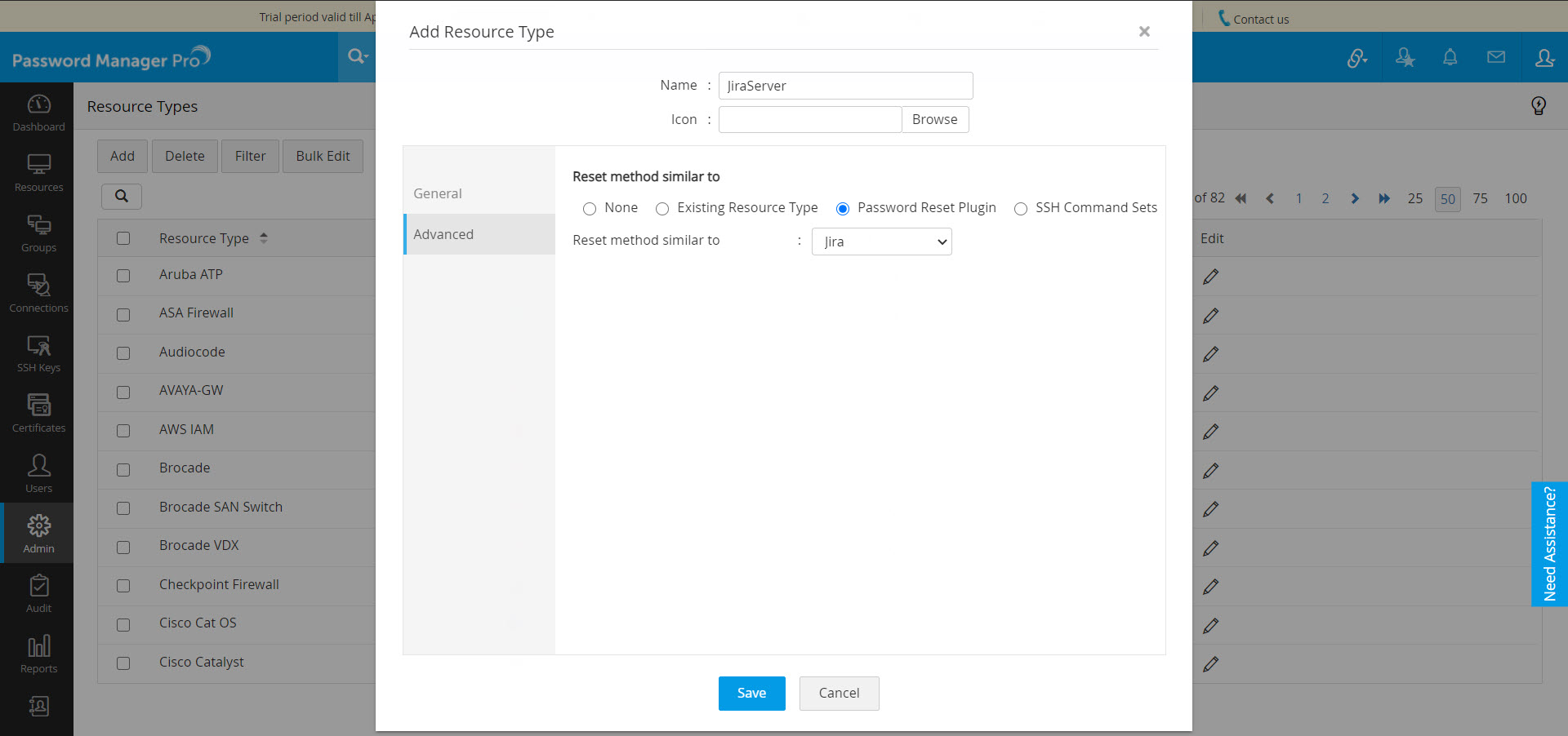 - プラグインが承認されたら、プラグインを使用してリソースのパスワードを変更するリソース種別を追加できます。これを行うには、[リソース] タブに移動し、上部にある[リソース種別]ボタンをクリックします。あるいは、[管理]>>[リソース設定]>>[リソース種別]に移動して、新しいリソース種別を追加することもできます。