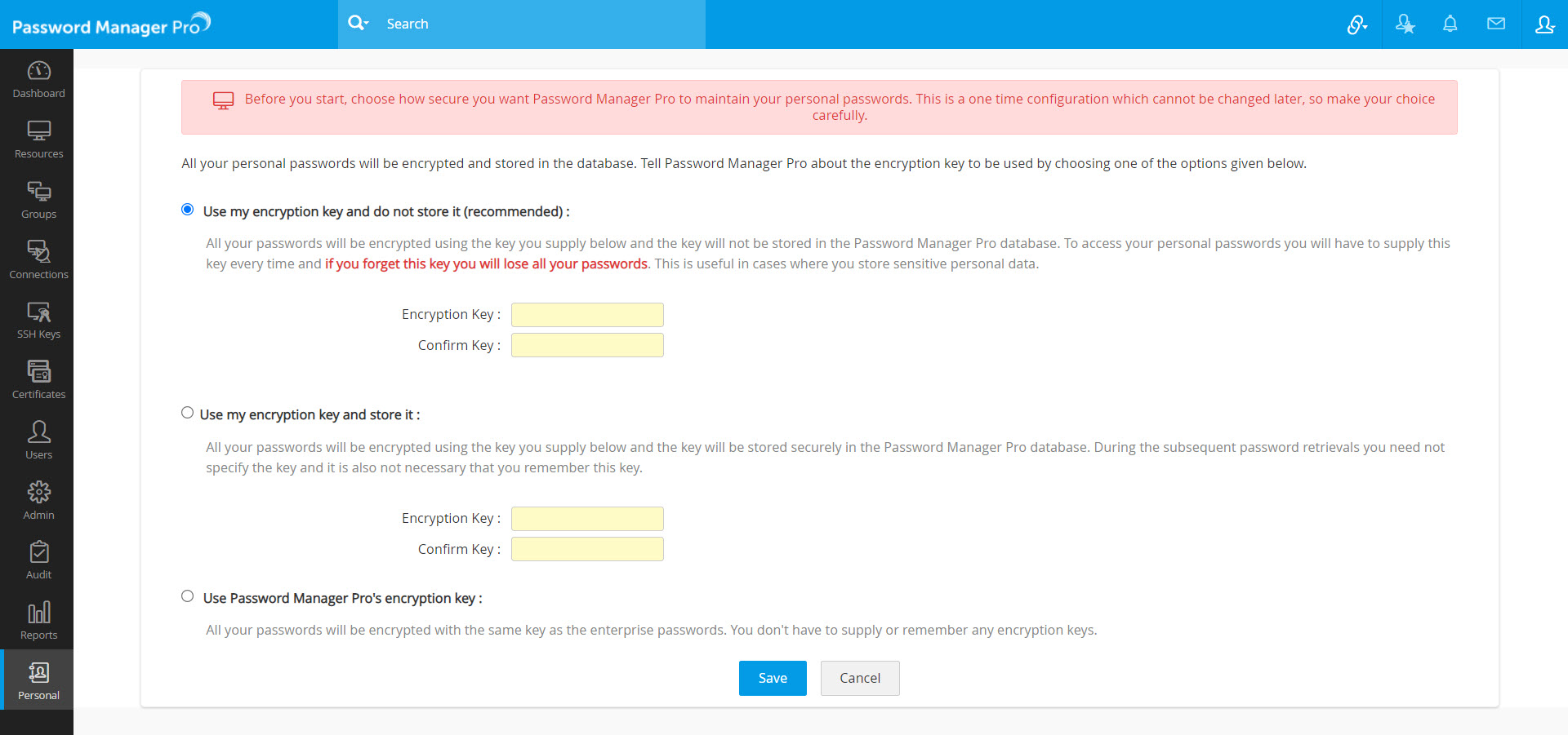 管理者が、ユーザーが個人用パスワードセクションで独自のパスフレーズを選択できるオプションを無効にすると、Password Manager Pro には、[パーソナル] タブに保存されているデータを保護するための暗号化方法を選択するオプションが表示されます。すべての個人用パスワードは暗号化されてデータベースに保存されることに注意してください。Password Manager Pro は、以下のオプションに基づいて選択した暗号化キーに基づいて個人データを暗号化します。
