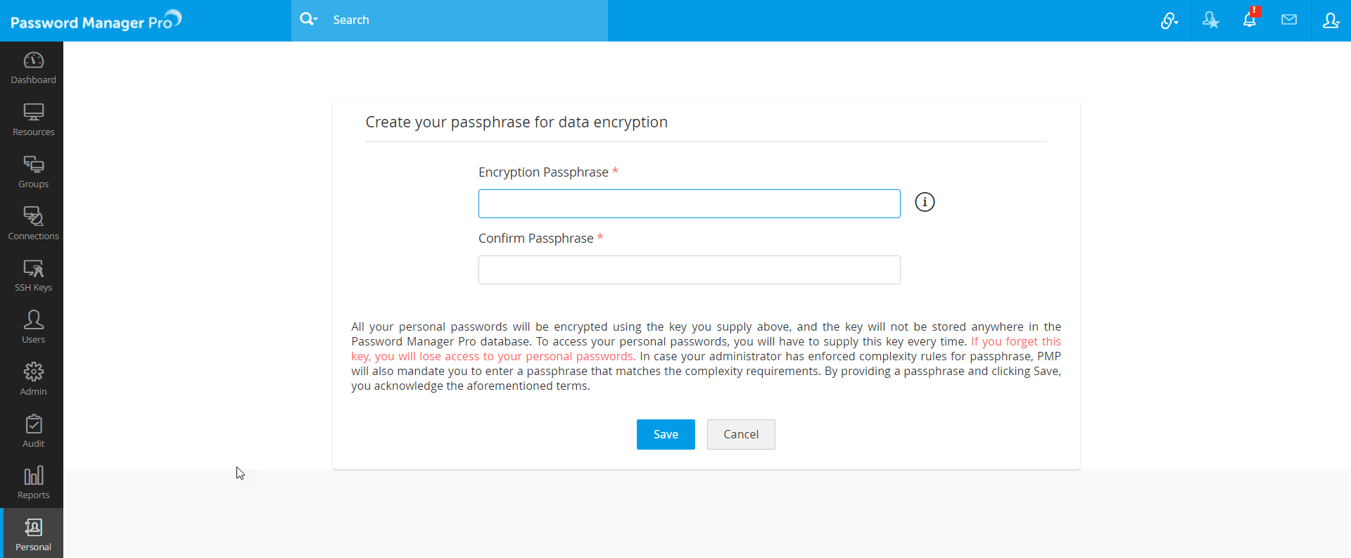 [パーソナル] タブにアクセスするには、暗号化パスフレーズを指定する必要があります。Password Manager Pro の [パーソナル] タブの使用はオプションですが、管理者は [一般設定] からすべてのユーザーに暗号化パスフレーズの作成を強制できます。強力なパスワードポリシーを設定するには、[一般設定] ページに移動するか、[管理] >> [カスタマイズ] >> [パスワードポリシー] に移動して、要件に応じてパスワードポリシーをカスタマイズします。