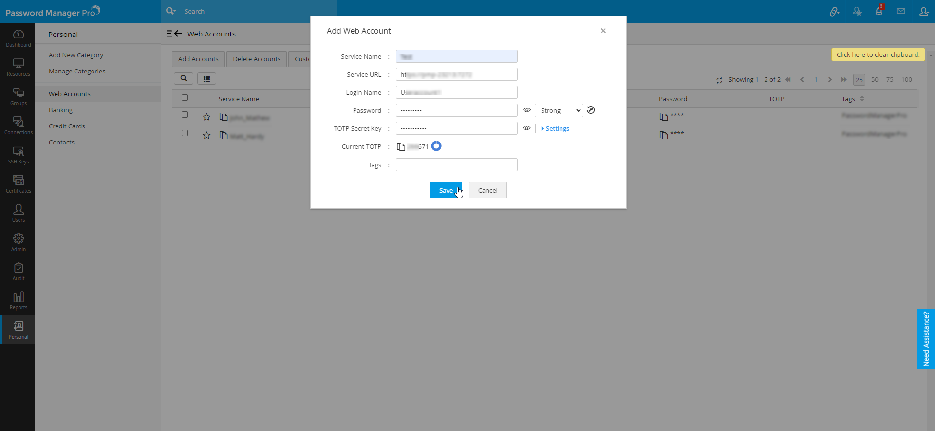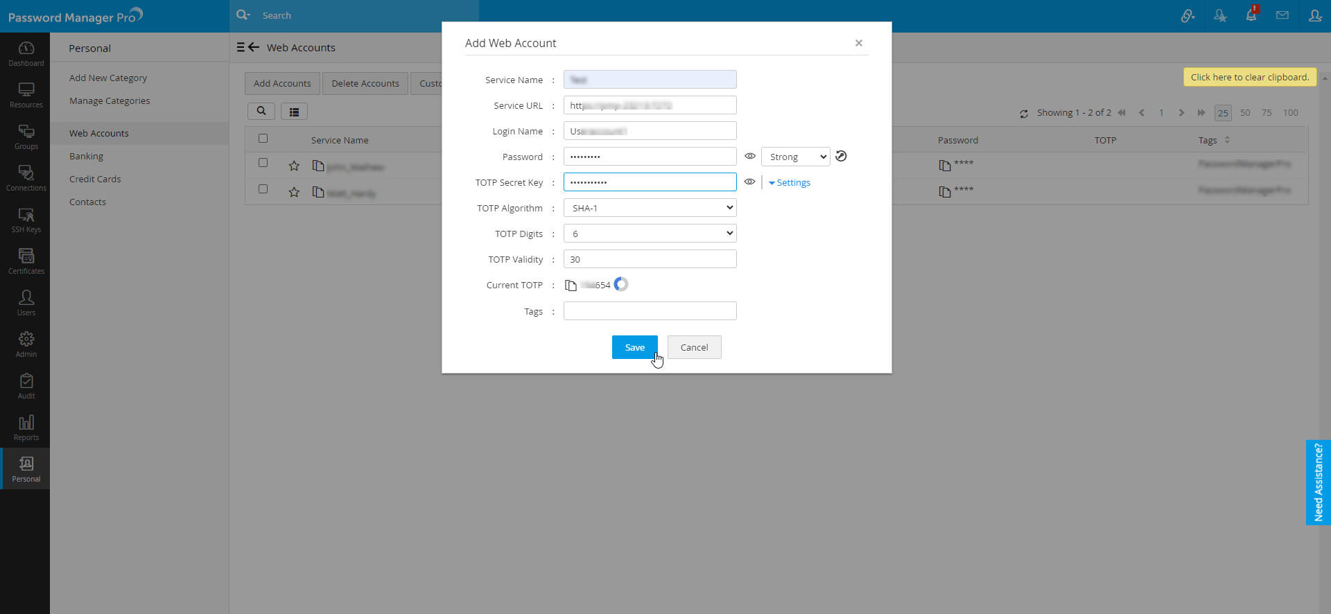 - TOTP 秘密鍵: Web アカウントで2段階認証(2FA)としてタイムベースドワンタイムパスワード(TOTP)が有効になっている場合は、TOTP 秘密鍵を入力します。これにより、Password Manager Pro インターフェイスを介してアカウントに直接アクセスできるようになり、追加されたパスワードとともに TOTP ワンタイム コードの生成が効率化されます。