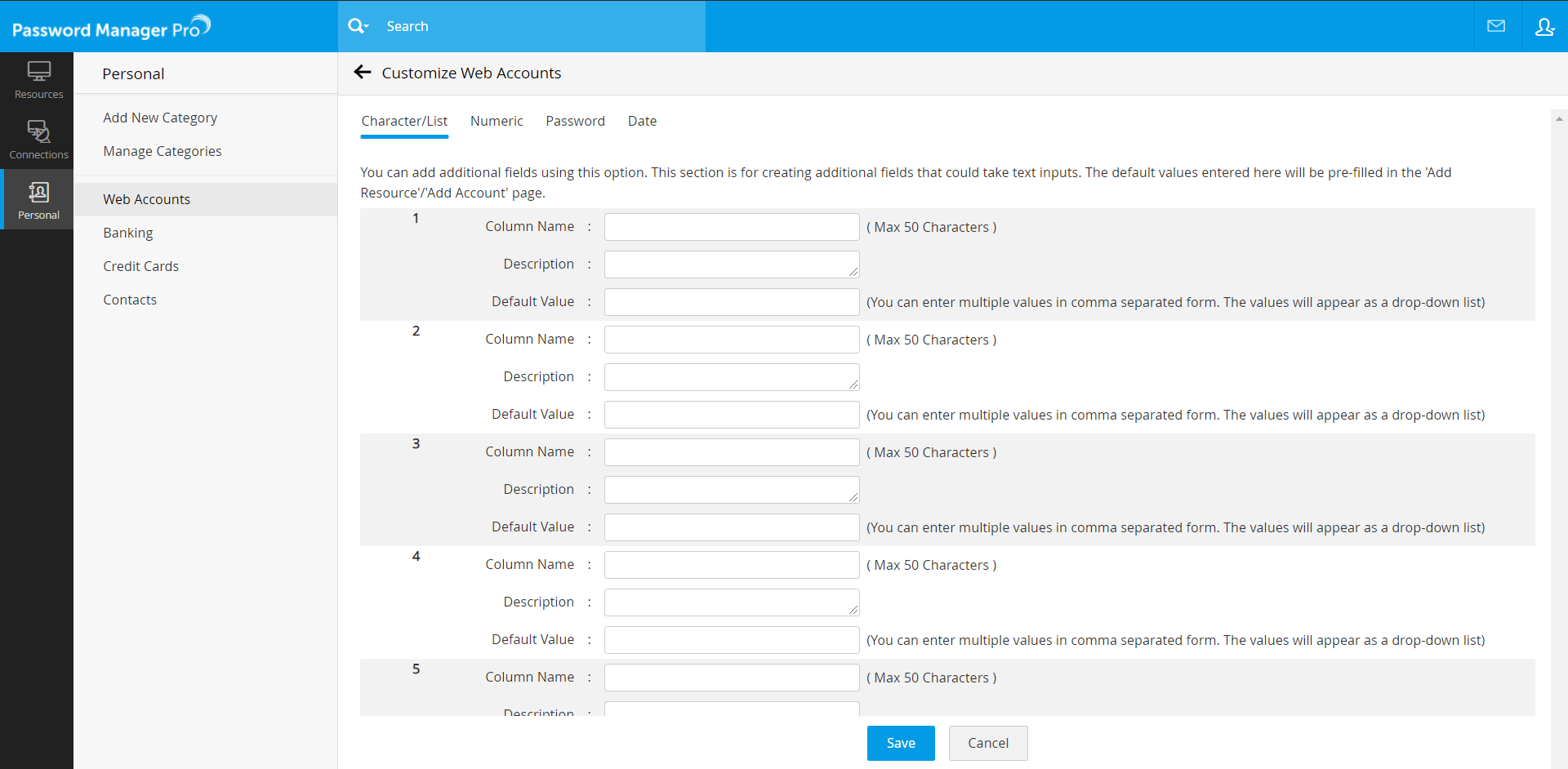 - 最大9つの文字/一覧フィールド、4つの数値フィールド、3つのパスワードフィールド、および4つの日時フィールドを追加できます。[保存]をクリックして、カスタムフィールドをデフォルトのカテゴリの隣に新規カテゴリとして追加します。カスタムフィールドは一度追加すると削除できないことに注意してください。