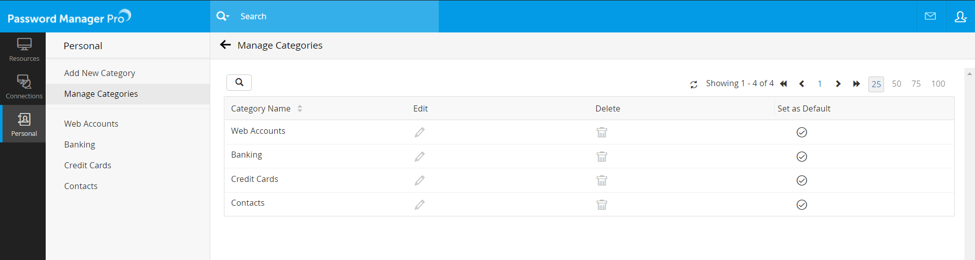Password Manager Pro Web インターフェースには個人用パスワードを保存するための機能が用意されています。たとえば、個人のメールアカウント、クレジットカード番号、銀行口座、連絡先住所、電話番号、メールアドレスなどを保存できます。これらの情報には、あなただけがアクセスでき、他の人はアクセスできません。これにより、完全なデータプライバシーが確保されます。