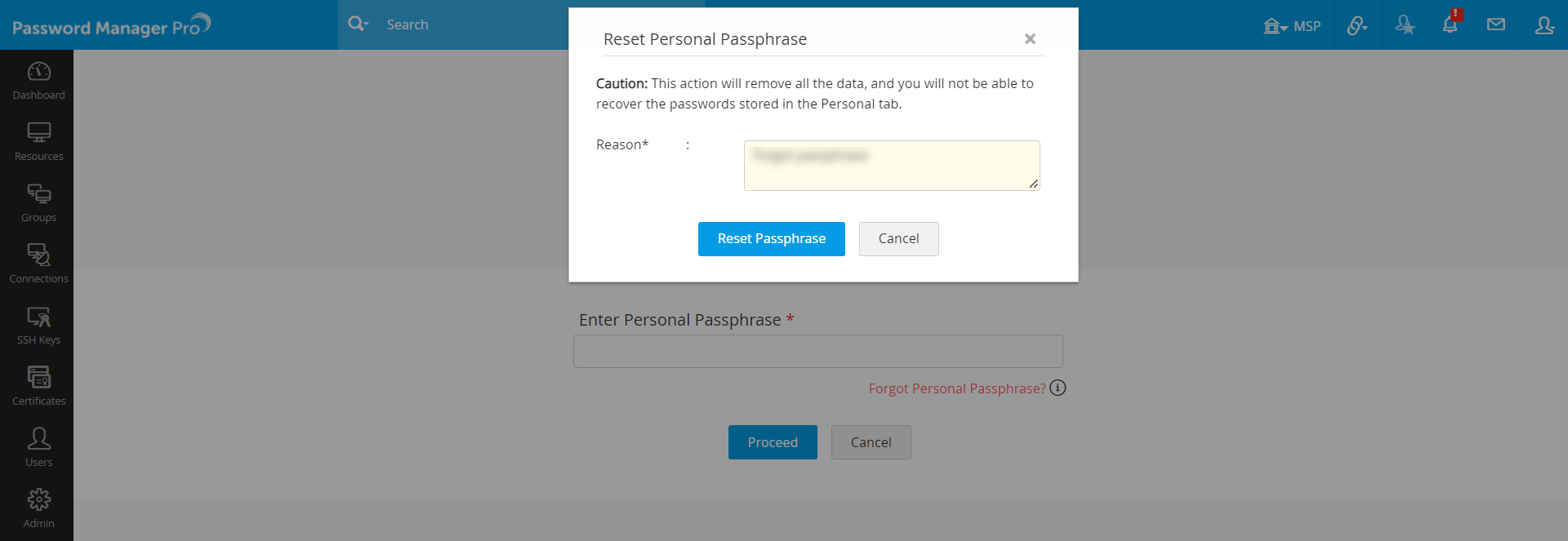 Password Manager Pro を使用すると、個人パスフレーズをリセットできます。個人パスフレーズをリセットすると、[パーソナル] タブに保存されているすべてのデータが完全に削除されることに注意してください。