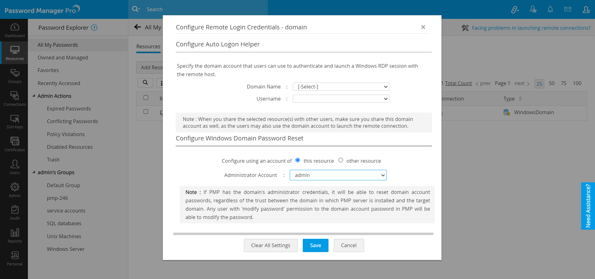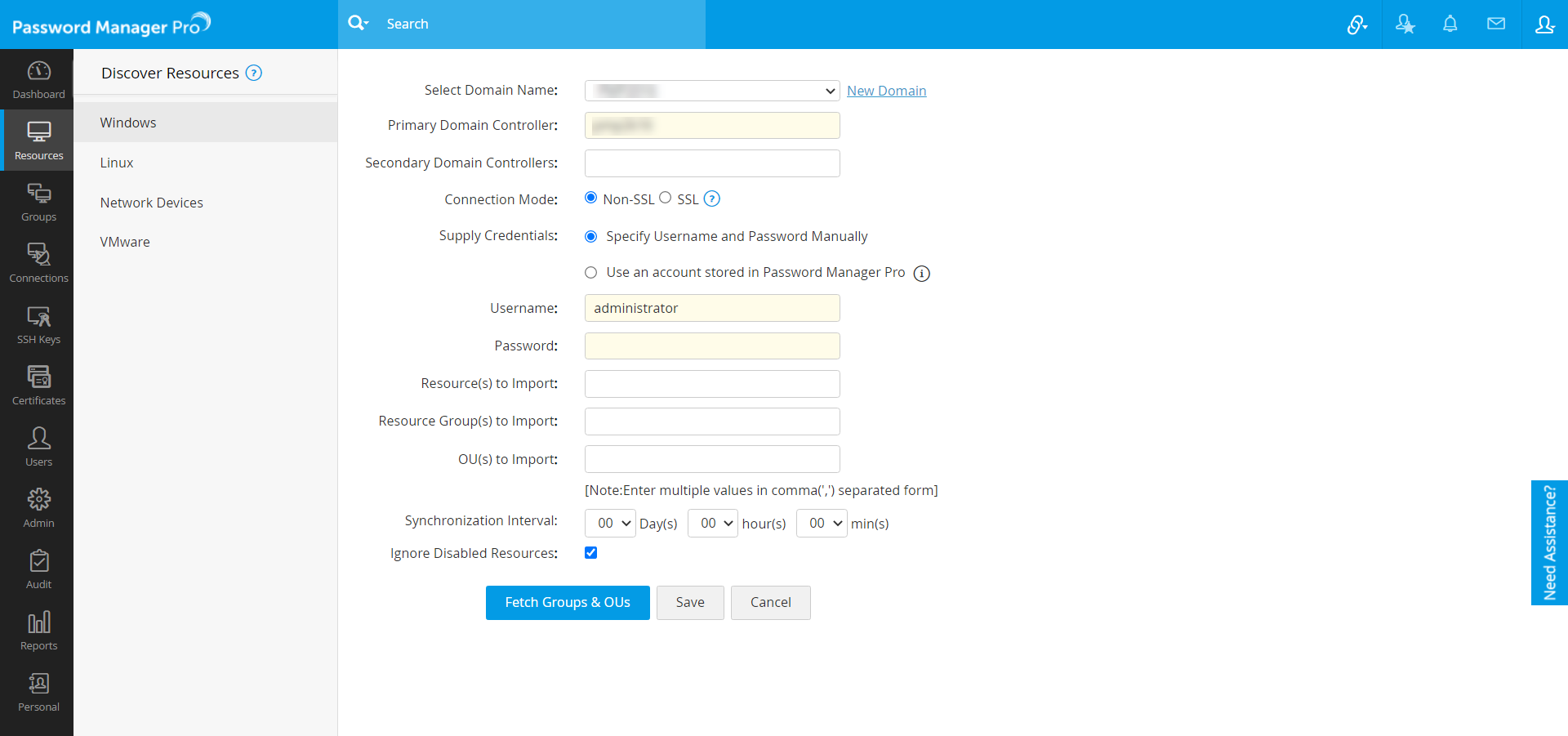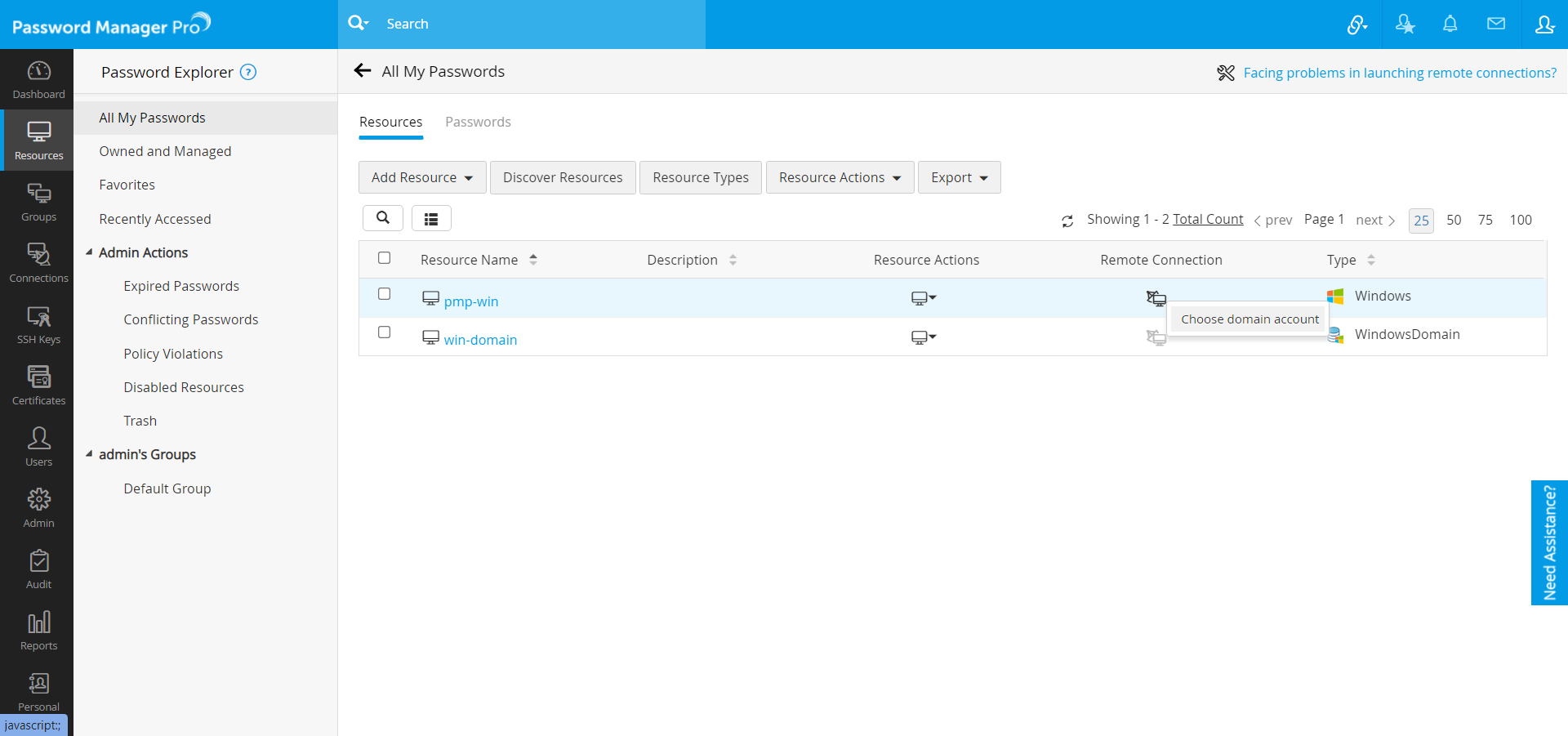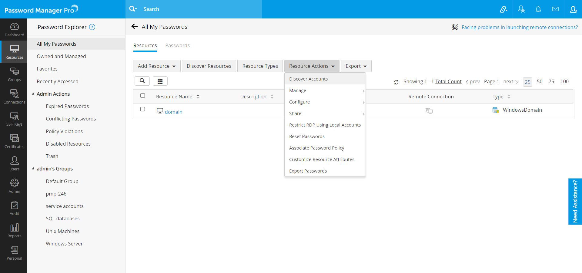 - 最初に、Password Manager Pro は、ドメイン名を使用して Windows ドメイン リソースを作成します。たとえば、ドメイン名が[Password Manager Pro]の場合、作成されるリソース名も[Password Manager Pro - Domain Controller]になります。