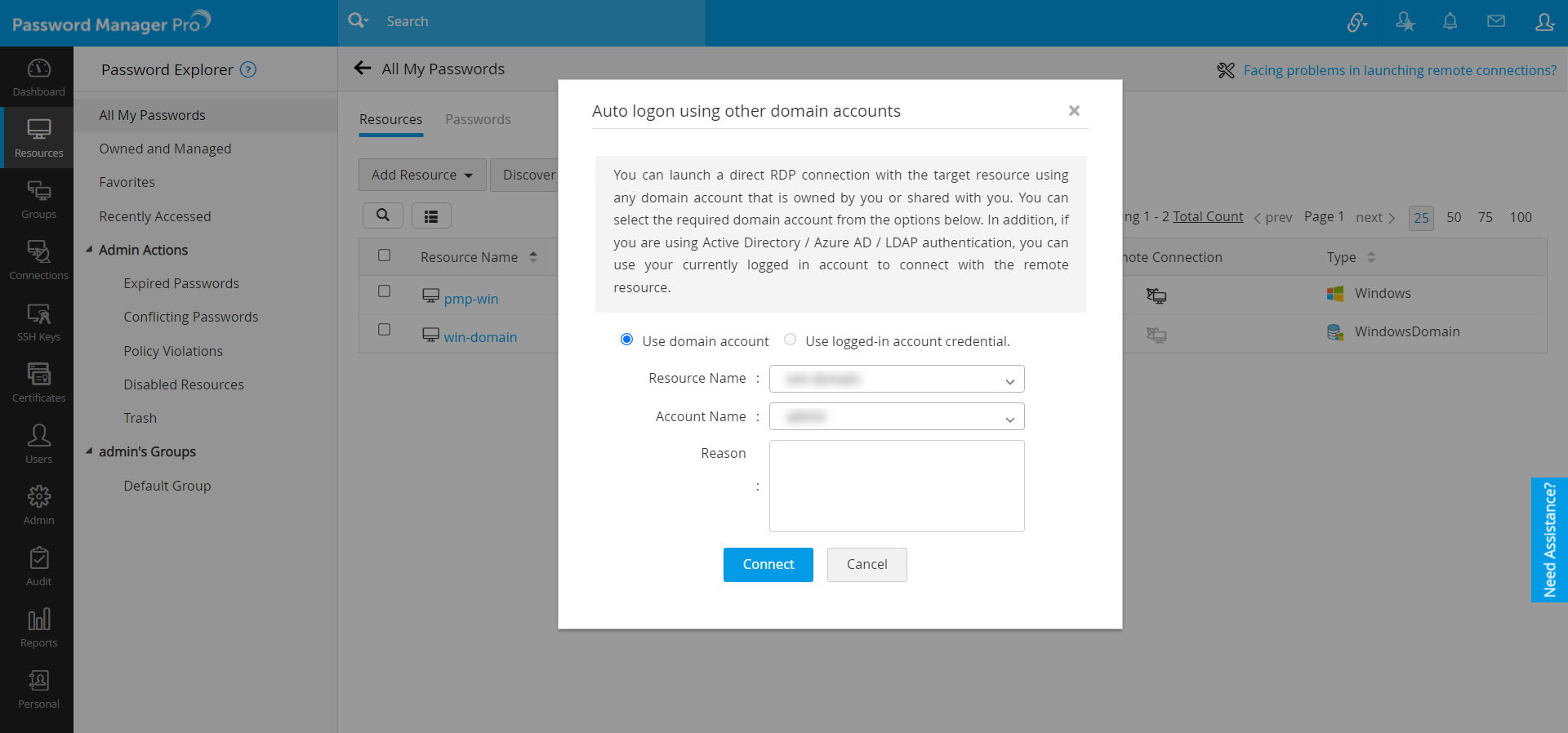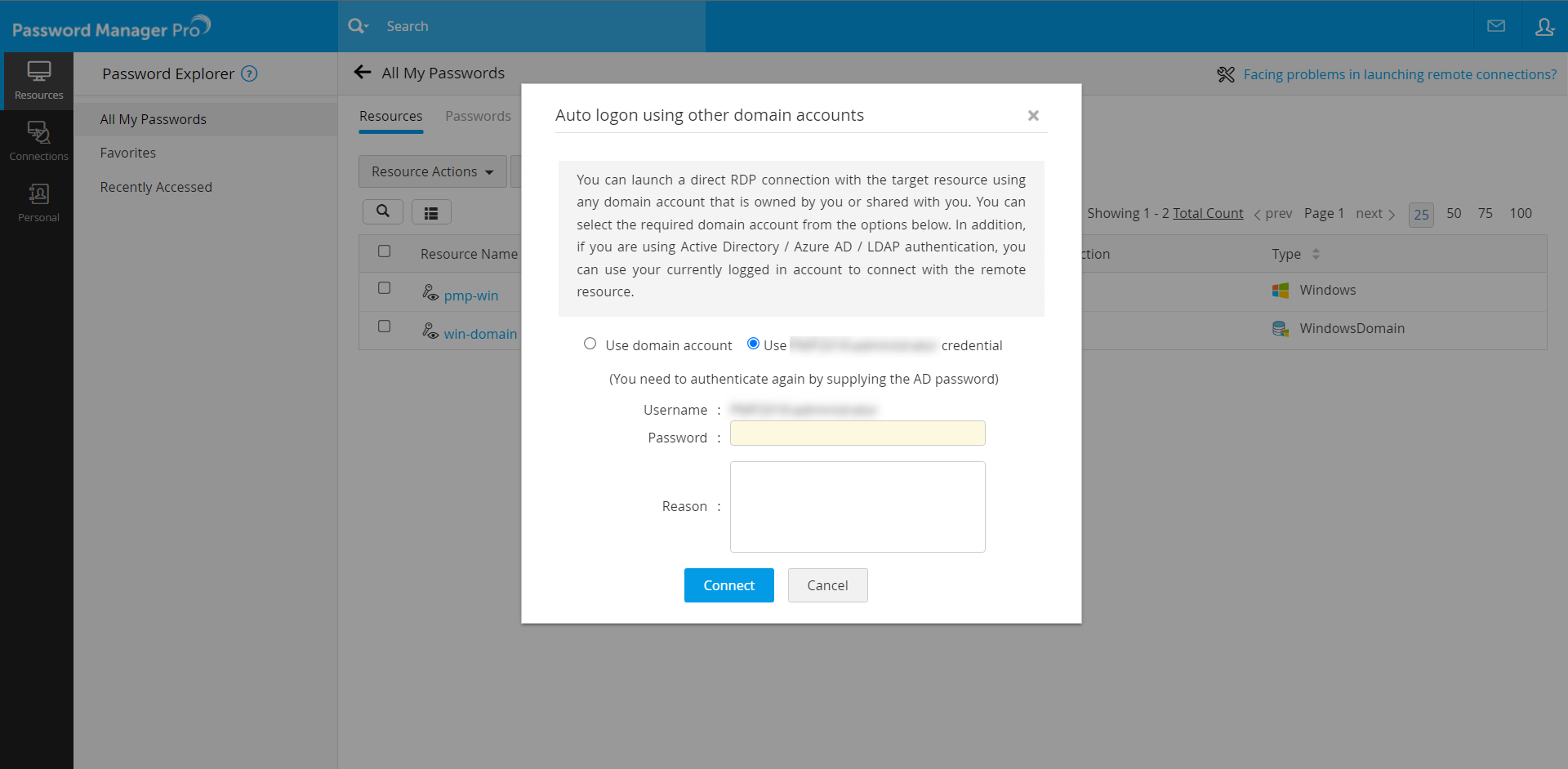 Password Manager Pro を使用すると、ユーザーは、所有者または共有されている任意のドメイン アカウントを使用して、ターゲット リソースとの直接 RDP 接続を開始できます。ユーザーは、必要なドメイン アカウントを選択することも、現在ログインしている AD/Azure AD/LDAP アカウントを使用して、目的のリソースに接続することもできます。そのためには、