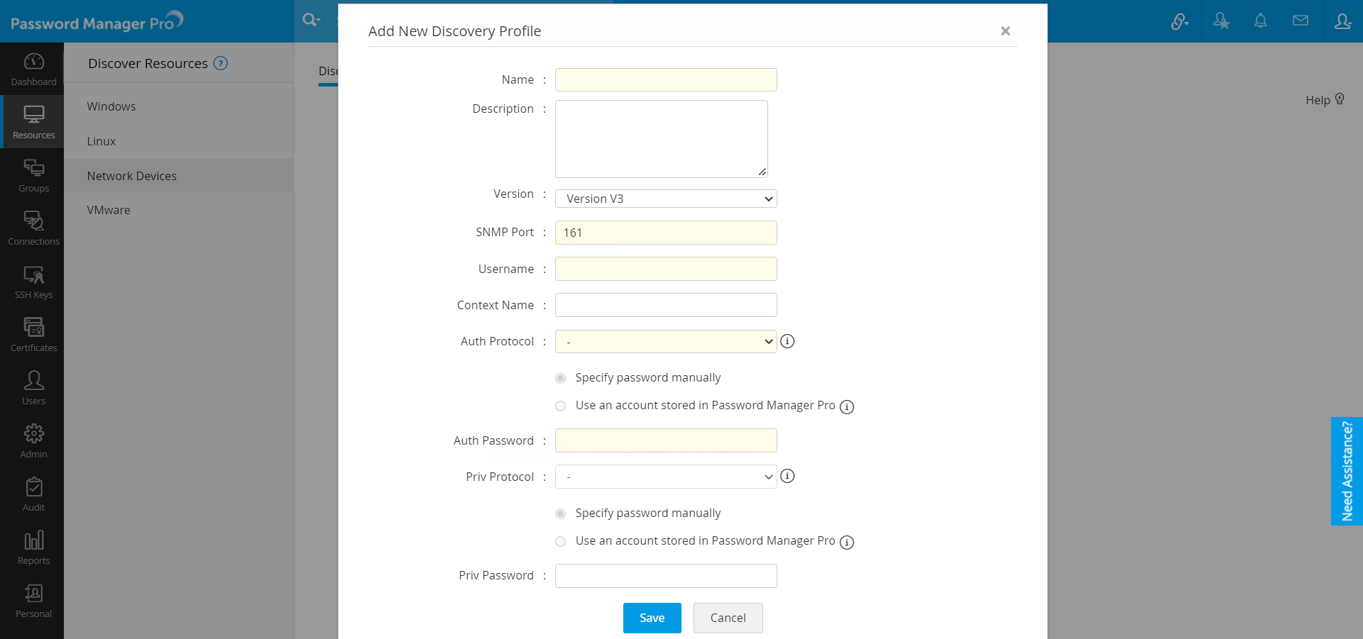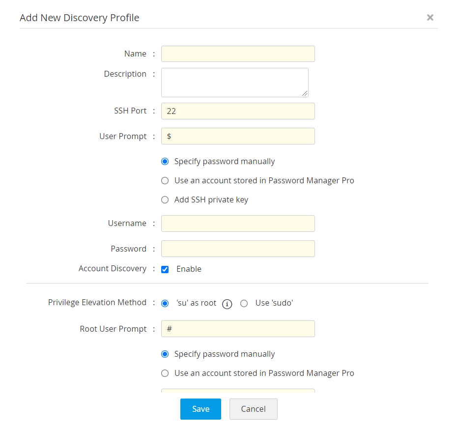 - Password Manager Pro は、特権アカウントディスカバリー用の特定のリソースの種類のみをサポートします。お使いのデバイスのいずれかがサポートされていないものの、サポートされている他の種類と類似している場合は、利用可能な最も近いリソース の種類を選択し、アカウントディスカバリーを試みることができます。