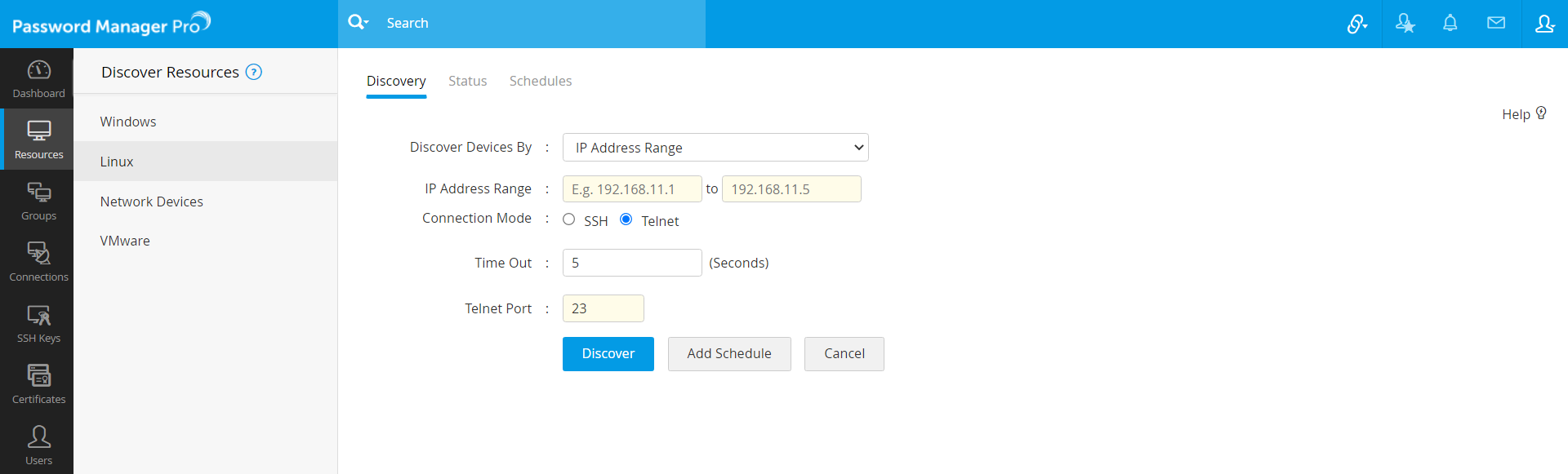 Password Manager Pro は、Telnet と SSH をリモート接続モードとして使用して、Telnet/SSH が実行されているデバイスをディスカバリーします。