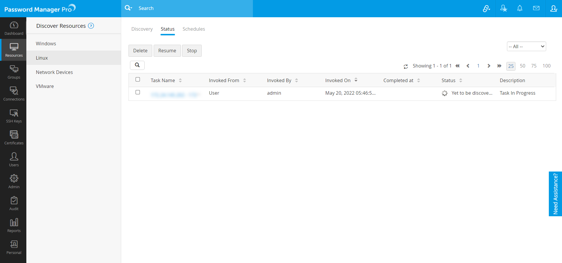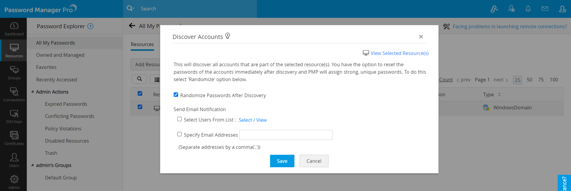 - リソースディスカバリーが成功すると、選択したすべてのリソースを Password Manager Pro に追加できます。