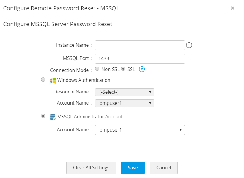 - Password Manager Pro に保管されているアカウントを使用:このオプションを選択した場合は、それぞれのドロップダウンからリソース名とアカウント名を選択する必要があります。