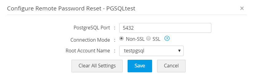 - PostgreSQL サーバーの場合、デフォルトのポートは 5432 です。[ルート アカウント名] ドロップダウン リストから管理者アカウントを選択し、設定を保存します。
