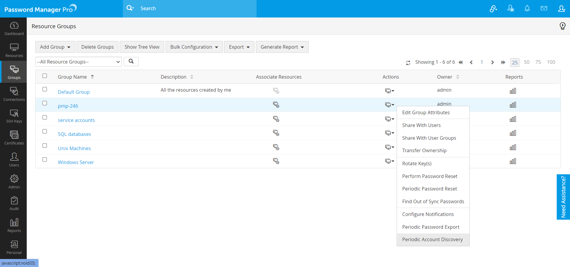 - [リソース グループ] タブで、[アクション] ドロップダウンから [定期的なアカウントディスカバリー] を選択します。これを使用すると、スケジュールされたタスクを作成して、リソース グループに属するリソースの一部であるアカウントを定期的にディスカバリーできます。