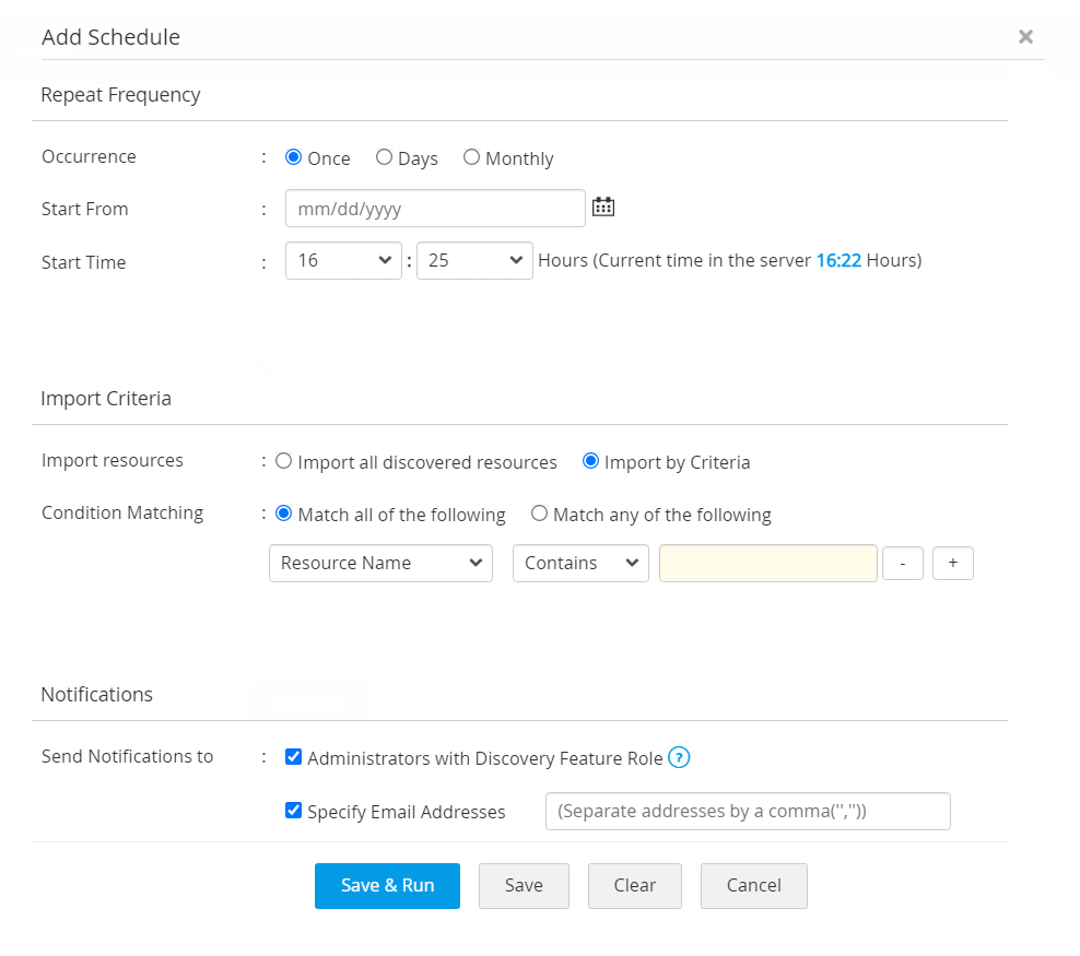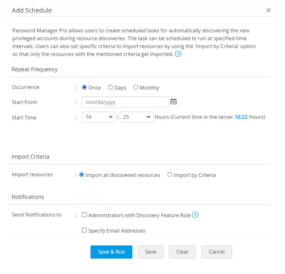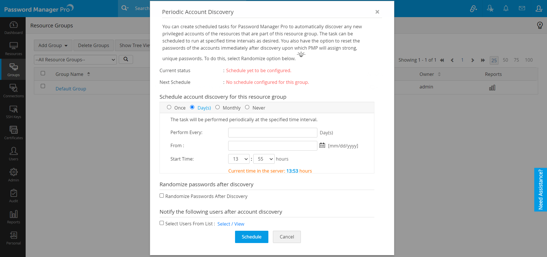 - 定期的なリソースディスカバリーをスケジュールする場合は、[スケジュールの追加]をクリックします。新しいウィンドウが表示され、リソースディスカバリー中に新しく追加されたアカウントをディスカバリーするための自動スケジュールされたタスクを作成できます。さらに詳しく知りたい場合は、ここをクリックしてください。