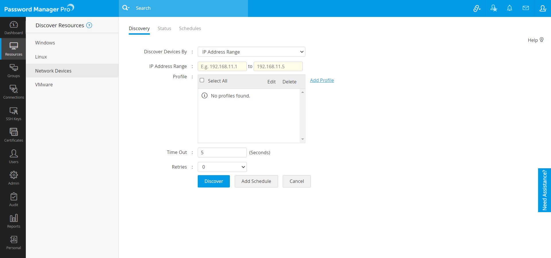 ネットワーク デバイスのディスカバリーを続行する前に、Password Manager Pro が複数のデバイスのディスカバリーに共通の詳細を使用できるようにするディスカバリープロファイルを作成する必要があります。