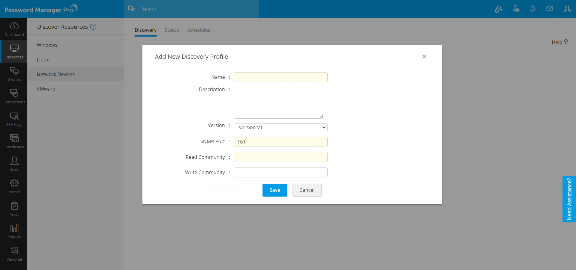 - リソースをディスカバリーするとき、Password Manager Pro はリソース タイプ フィールドにも入力します。ただし、リソース タイプ フィールドをチェックして、正しいタイプが選択されていることを確認してください。それ以外の場合は、種類を変更してください。