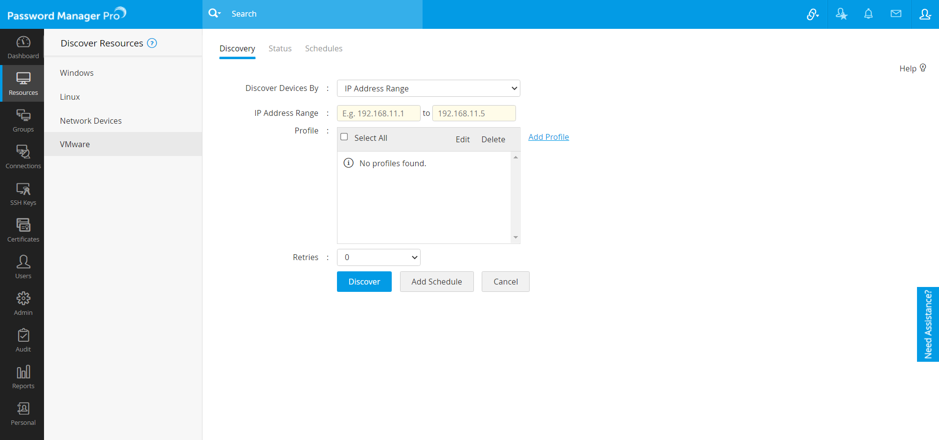 Password Manager Pro にリソースを追加するための最初のステップは、ネットワーク内に存在するさまざまなエンドポイントをディスカバリーすることです。次のセクションでは、Password Manager Pro がさまざまなエンドポイントをディスカバリーする方法について説明します。