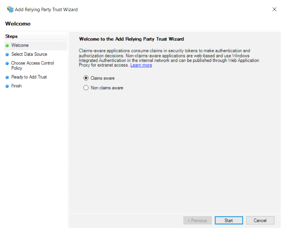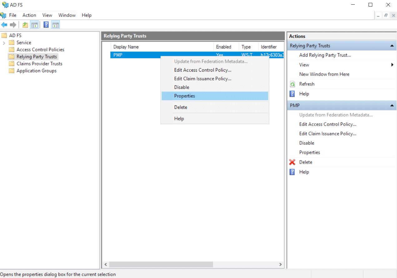 - 最初の手順では、Trust RelationshipsをADFS 10.0に追加し、Password Manager Proの情報を追加します。Trust Relationshipsで、Relying Party Trustsを右クリックし、Add Relying Party Trust(証明書利用者信頼の追加)をドロップダウンメニューから選択します。Add Relying Party Trust(証明書利用者信頼の追加)ウィザードが画面に表示されます。