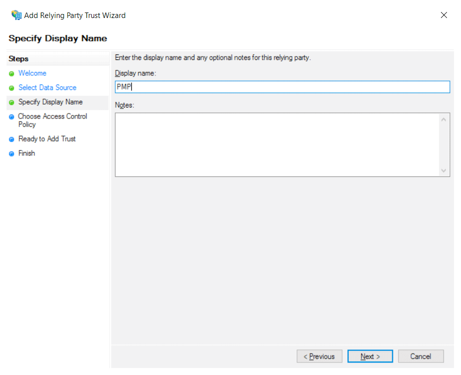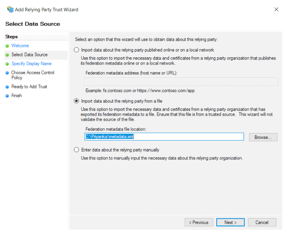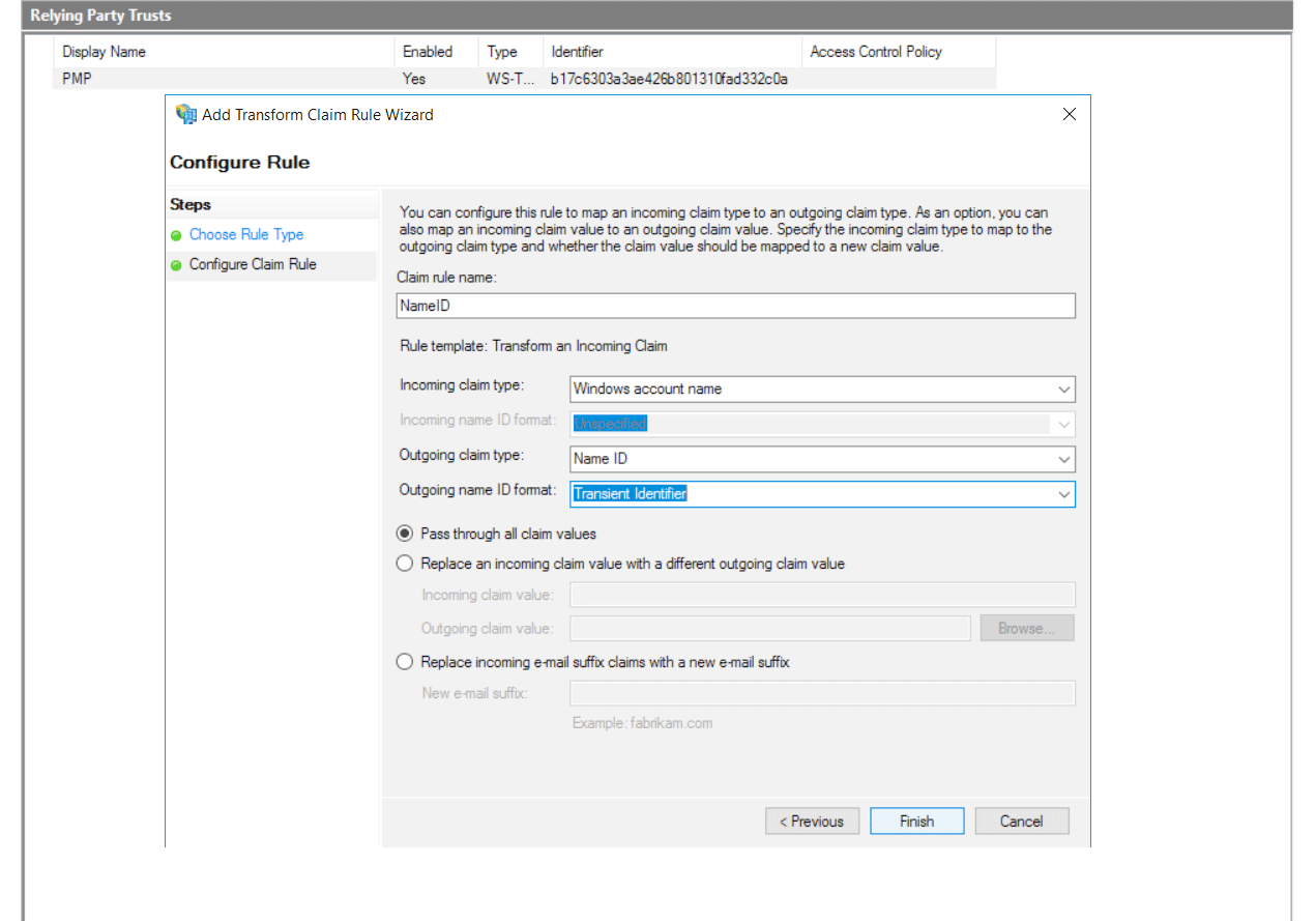 注記:ADからPassword Manager Proにすでにユーザーがインポートされている場合、ログイン名は、DOMAIN\Loginnameの形式で保存されます。デフォルトでは、Windowsアカウント名を受信クレームタイプとして設定すると、この形式と一致します。ただし、ADユーザーのCSVファイルをインポートして、Password Manager Proのローカルアカウントを作成した場合、Password Manager Proに保存されているログイン名と一致する、別のクレームタイプを選択する必要があります。