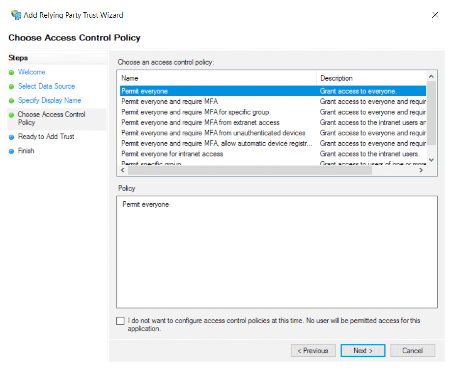 - アクセスコントロールポリシーを選択します。[すべてのユーザーに対してこの証明書利用者へのアクセスを許可する]を選択し、[次へ]をクリックします。