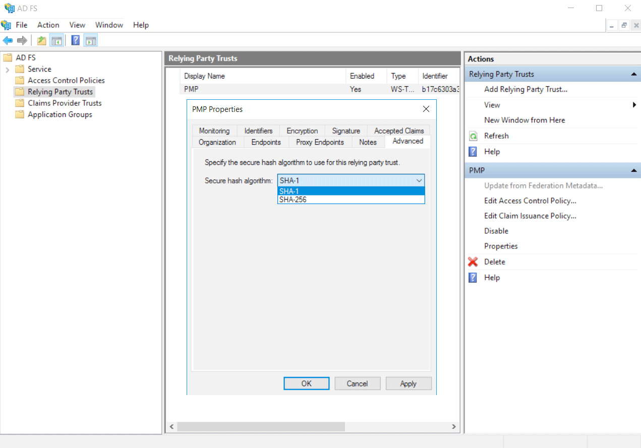 - 開いたダイアログボックスで、[詳細]タブに切り替え、セキュアハッシュアルゴリズムとしてSHA 1を選択します。変更を適用して、[Ok]をクリックします。