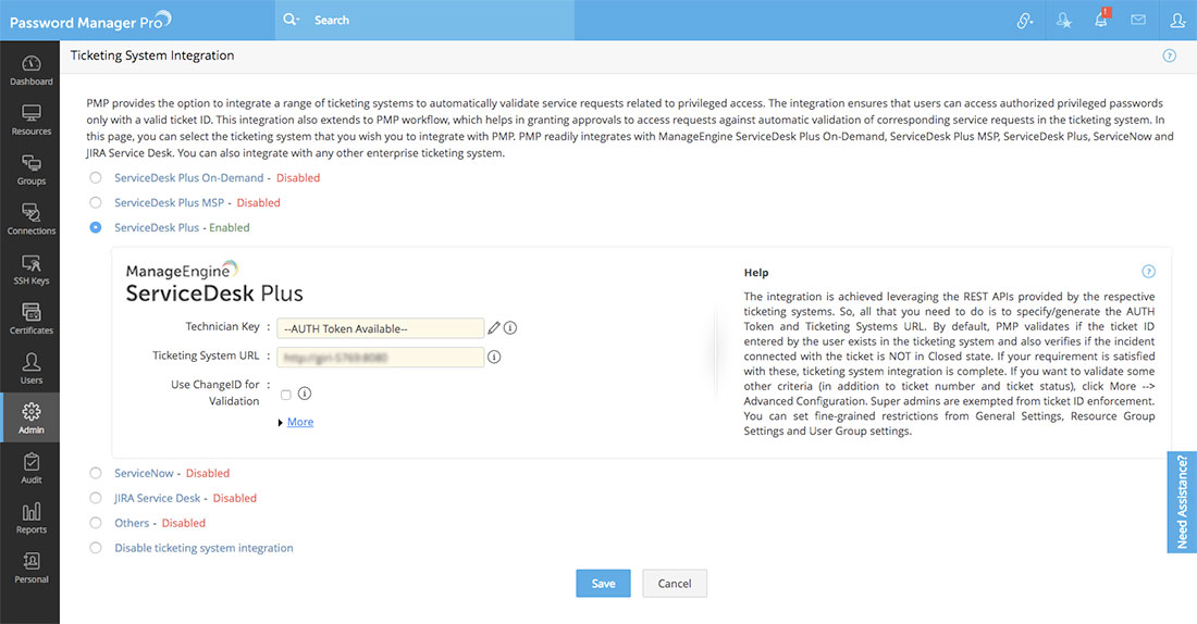 前提条件:CMDB連携の設定に進む前に、Password Manager Proでは、ServiceDesk Plusが実行されているサーバーの情報と、技術者キーが必要です。