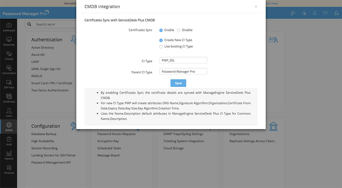 Password Manager Proには、ManageEngine ServiceDesk Plusの構成管理データベース(CMDB)との連携オプションがあります。この連携では、SSL証明書の情報をPassword Manager ProのリポジトリからServiceDesk PlusのCMDBへのエクスポートすることが可能なため、管理者は、ServiceDesk Plusのインターフェイスから直接、SSL証明書の組織全体の使用状況、有効期限およびその他の面を監視できます。