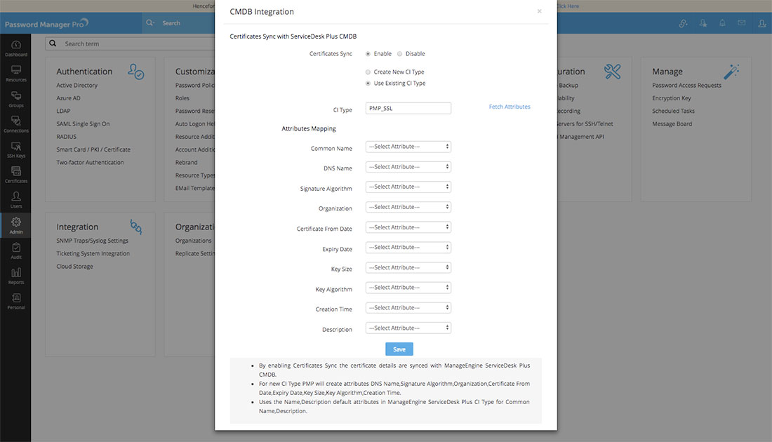 - マッピングが完了したら、[保存]をクリックします。Password Manager Proのリポジトリのすべての証明書が、SDPのCMDBにエクスポートされます。