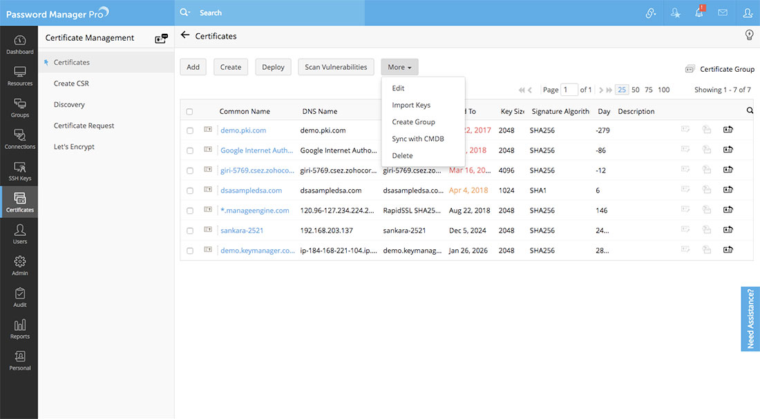 - テーブルビュー上にあるその他オプションをクリックし、[CMDBと同期]をドロップダウンメニューから選択します。Password Manager Proのリポジトリのすべての証明書が、SDPのCMDBと同期されます。