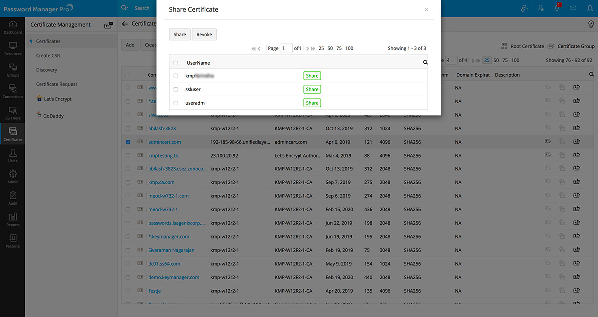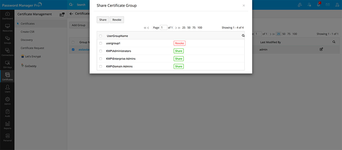 - 開いた新しいウィンドウで、証明書を共有するユーザーまたはユーザーグループを選択し、[共有]をクリックします。共有後、証明書へのアクセスは同じウィンドウからいつでも取り消すことができます。