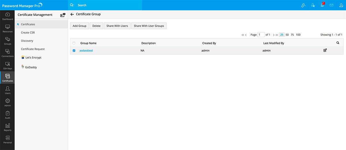 Password Manager Proを使用すると、証明書または証明書グループを、ユーザーおよびユーザーグループと共有できます。証明書を共有すると、その証明書のすべての情報が自動で共有されます。一般的に、すべてのユーザーが、自分が所有する証明書と、自身に共有されている証明書にアクセスできます。