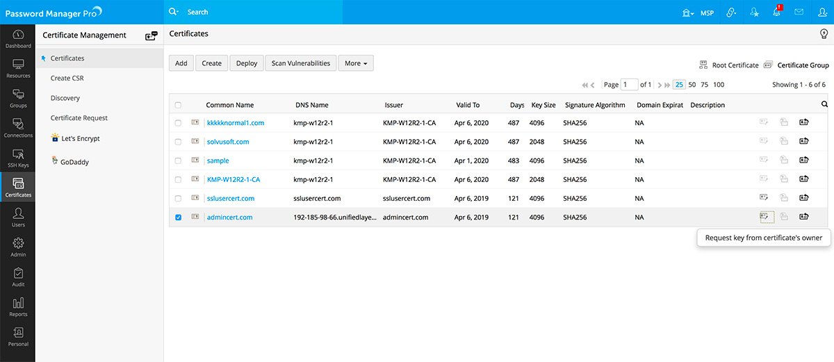 - [証明書]に移動し、一覧から共有証明書を選択して、証明書の横にある[KeyStore]アイコンから[証明書の所有者に鍵を要求する]をクリックします。