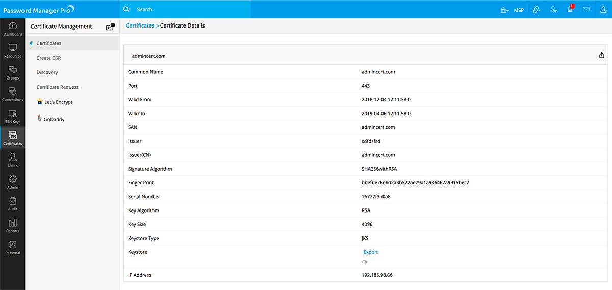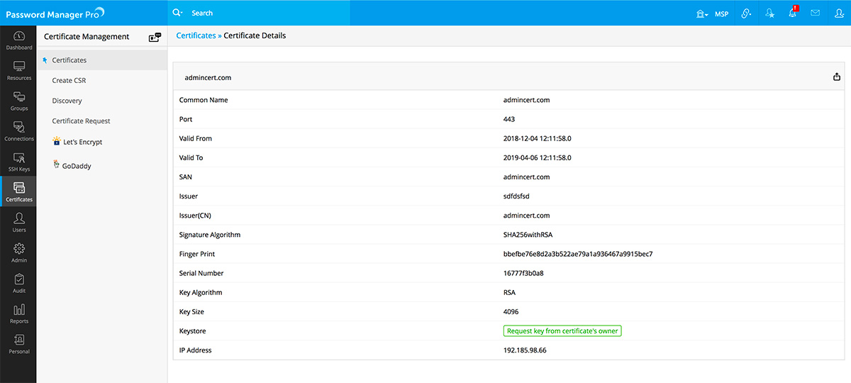 - 有効期限、鍵サイズ、アルゴリズム、長さ、DNS名などの証明書の詳細の表示