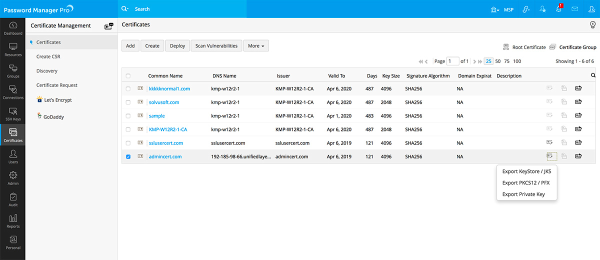 - 秘密鍵をエクスポートするには、[証明書]に移動し、共有証明書を選択して、証明書の横にある[KeyStore]アイコンから[秘密鍵をエクスポート]をクリックします。