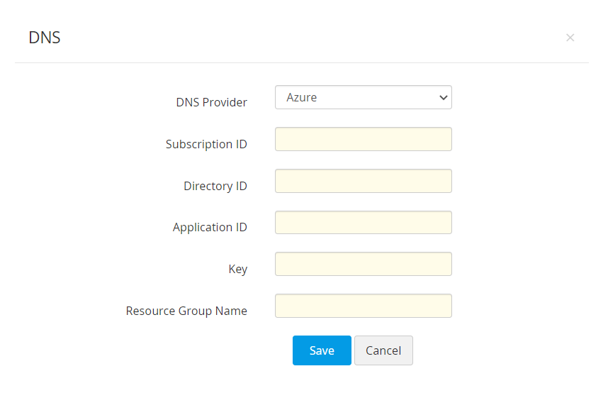 - DNSプロバイダーを選択します。Azure DNSの場合、必要な情報(サブスクリプションID、ディレクトリID、アプリケーションID、アプリケーションキー、およびリソースグループ名)を入力します。