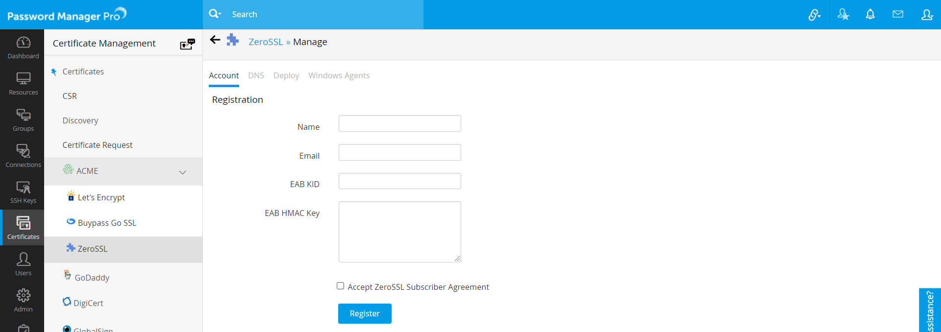 ZeroSSLからSSL証明書を要求するプロセスを開始するには、アカウントを作成する必要があります。これは1回限りのプロセスであり、Password Manager Proインターフェイスから直接実行できます。