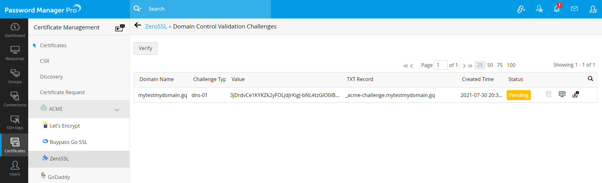 - チャレンジの処理は、自動化せずに手動で行うこともできます。チャレンジ値/テキストレコードをコピーして、ドメインサーバーに手動で貼り付けます。次に、Password Manager Proサーバーで、[保留中の要求]ページに移動し、[確認]をクリックします。チャレンジが検証され、証明書が発行されます。