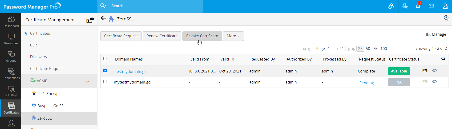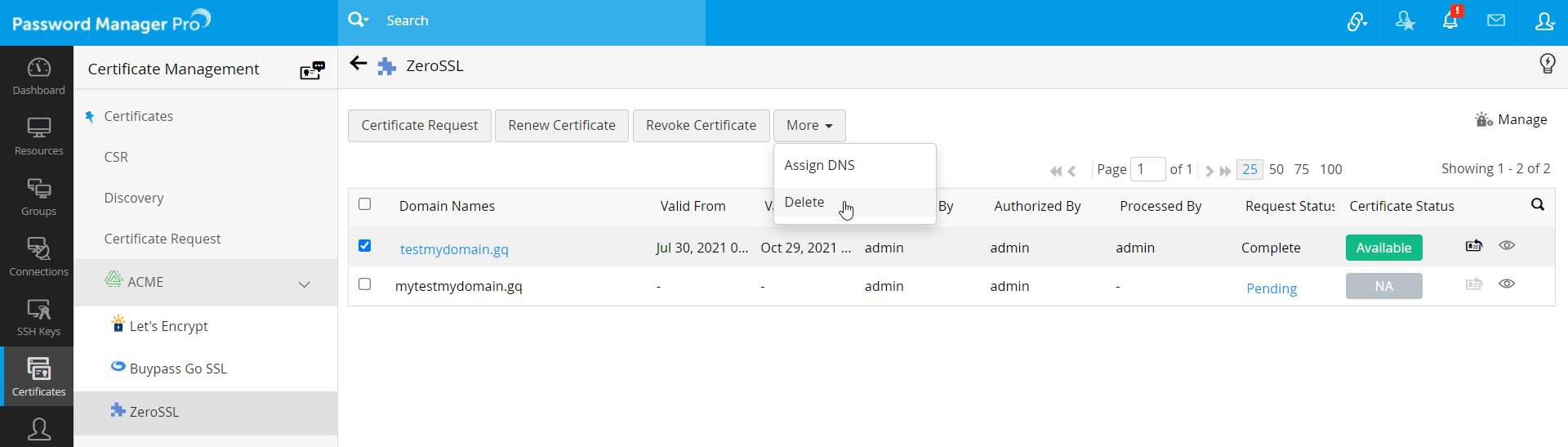 アカウントが作成されたら、アカウントのメールアドレスの更新、Password Manager Proからの削除、アカウントの完全な無効化ができます。アカウントを削除すると、Password Manager Proからのみ削除されることに注意してください。すなわち、アカウントを削除しても、ZeroSSLポータルでは引き続き有効です。同アカウントをPassword Manager Proに再度追加するには、鍵をエクスポートし、[アカウントの追加]オプションを使用して、以前と同じ情報を入力します。ただし、アカウントを削除する際に[非アクティブ化]オプションを選択すると、ZeroSSLのアカウントは完全に削除され、同じ情報を使用してPassword Manager Proに追加し直すことはできません。