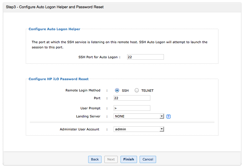 自動ログオンの設定PMPはWebインタフェースからSSHを経由したリソースへの安全な直接接続をサポートします。自動ログオンの設定はここで行います。SSH経由で接続する際、接続ポート番号が既定の22番以外の場合はポート番号を指定する必要があります。 リモートでのパスワード リセットを設定リソース上での実行にはTelnetまたはSSHサービスが必要です。PMPがリソースにログインするために、管理アカウントの情報と管理モードおよび設定モードのプロンプトを指定する必要があります。PMPはパスワード リセットのために設定グモードを使用します。HP ProCurveデバイスのパスワード リセットを有効化するには、次の資格情報を入力します: