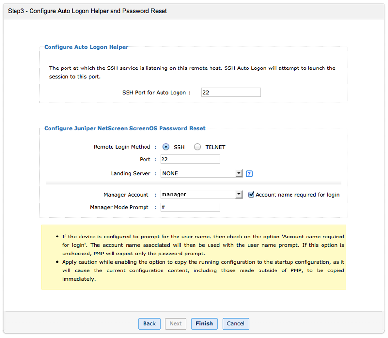 自動ログオンの設定 PMPはWebインタフェースからSSHを経由したリソースへの安全な直接接続をサポートします。自動ログオンの設定はここで行います。SSH経由で接続する際、接続ポート番号が既定の22番以外の場合はポート番号を指定する必要があります。 リモートでのパスワード リセットを設定 リソース上での実行にはTelnetまたはSSHサービスが必要です。PMPがリソースにログインするために、管理アカウントの情報と管理アカウントのプロンプトを指定する必要があります。Netscreenデバイスのパスワード リセットを有効化するには、次の資格情報を入力します: